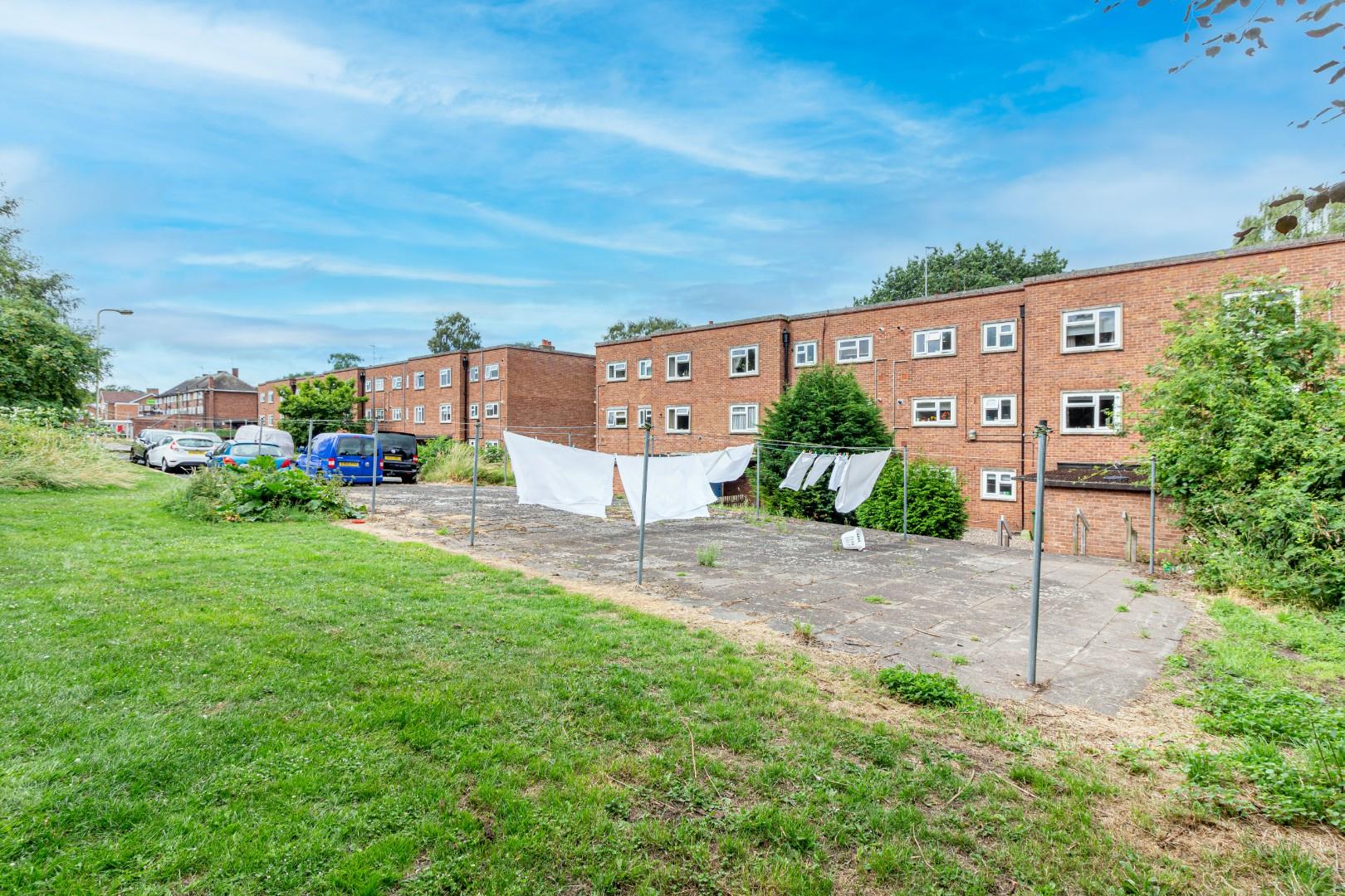 With secure access doorway to stairway, communal garden area to rear with vegetable patch, washing lines and parking area