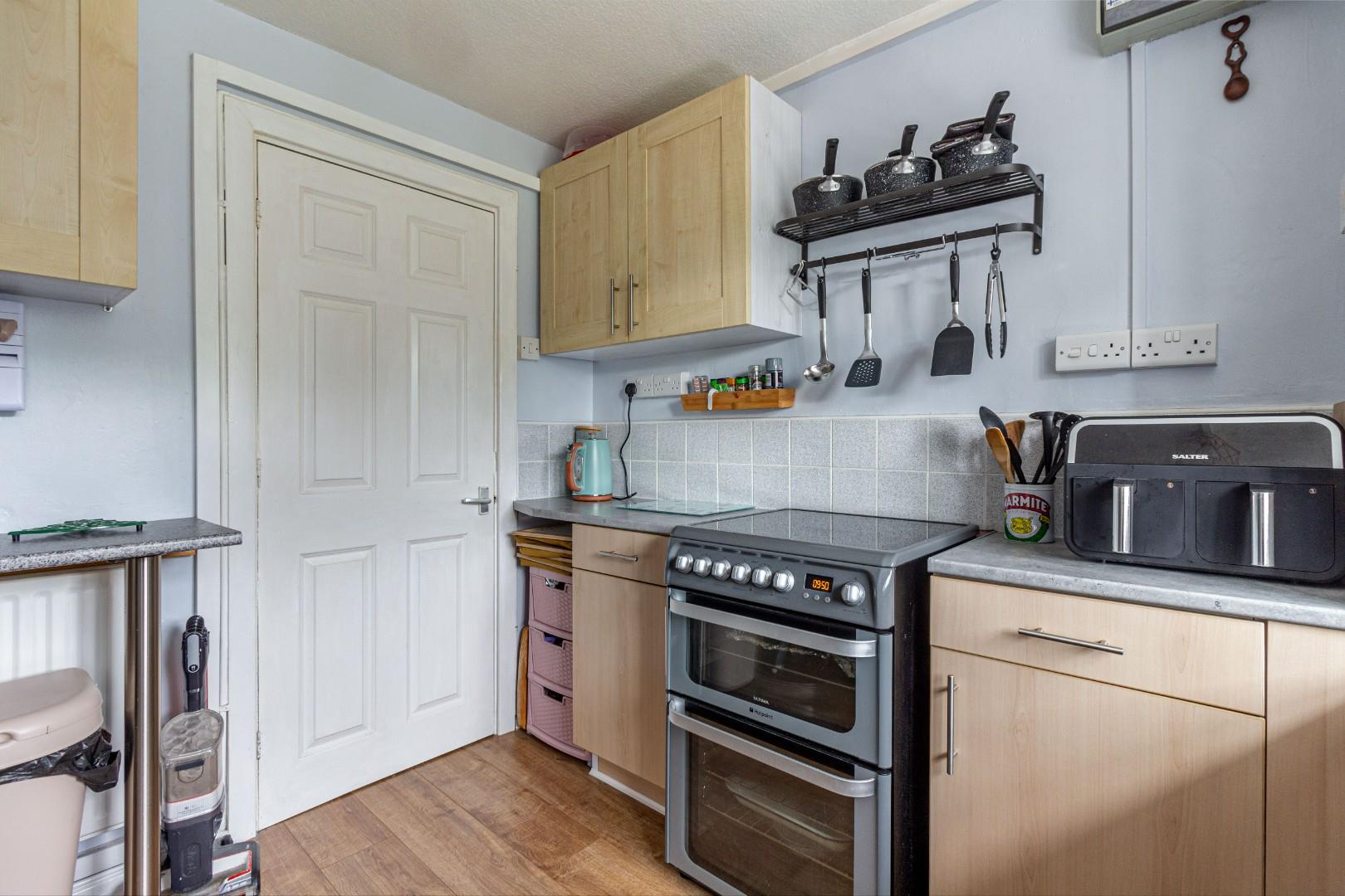 With a range of wall and floor mounted storage cupboards, built in store, double glazed window to rear and central heating radiator