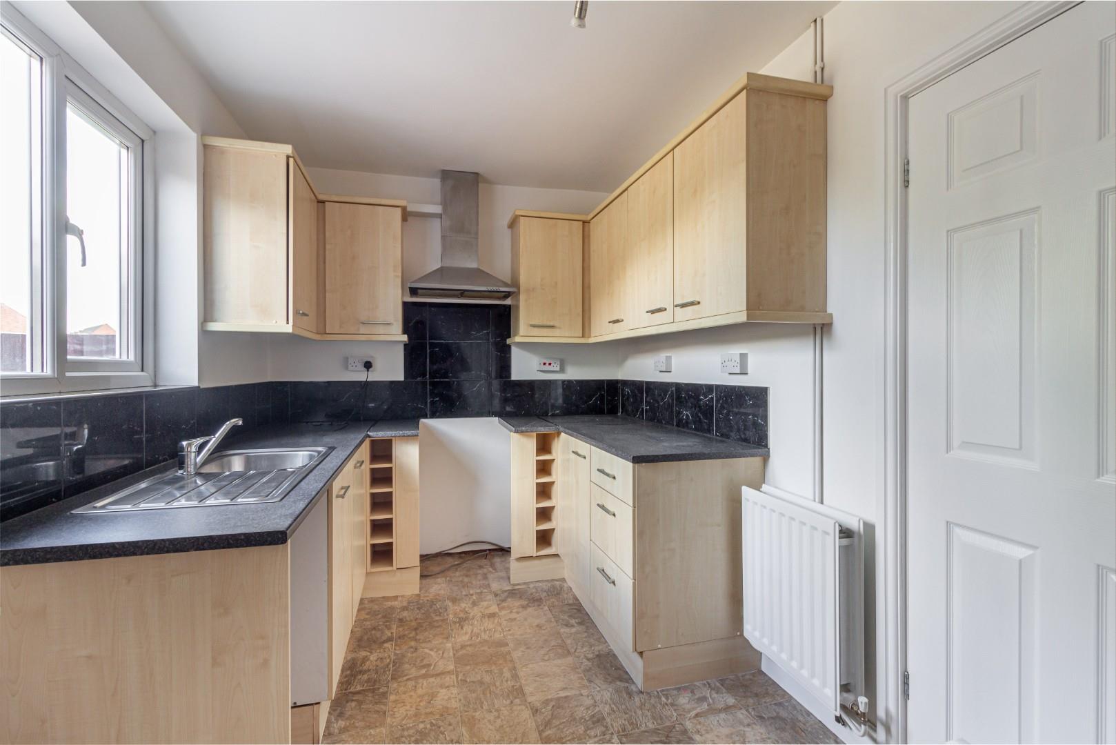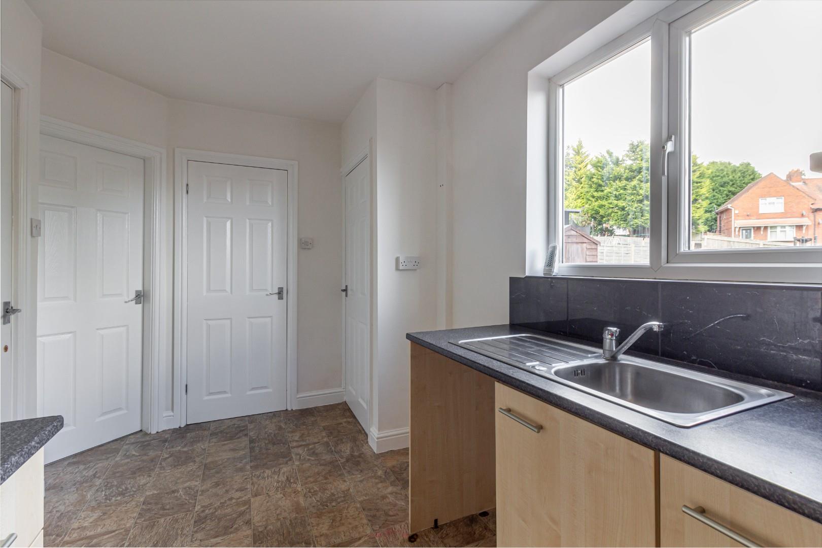 With window to rear, access to ground floor W.C, doorway access to lounge and rear garden with a range of wall and floor mounted cupboards, stainless steel sink with mixer tap and extractor hood