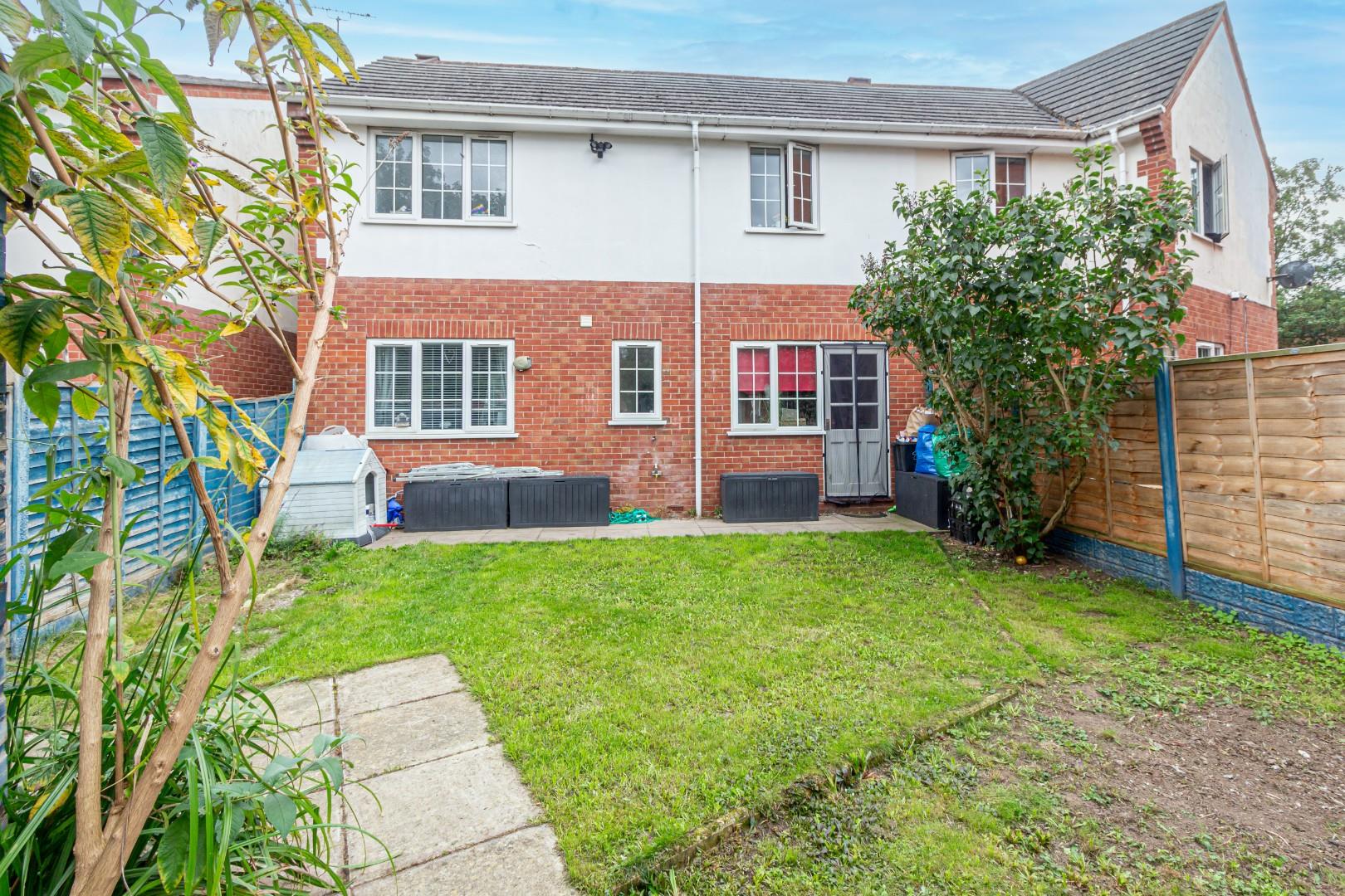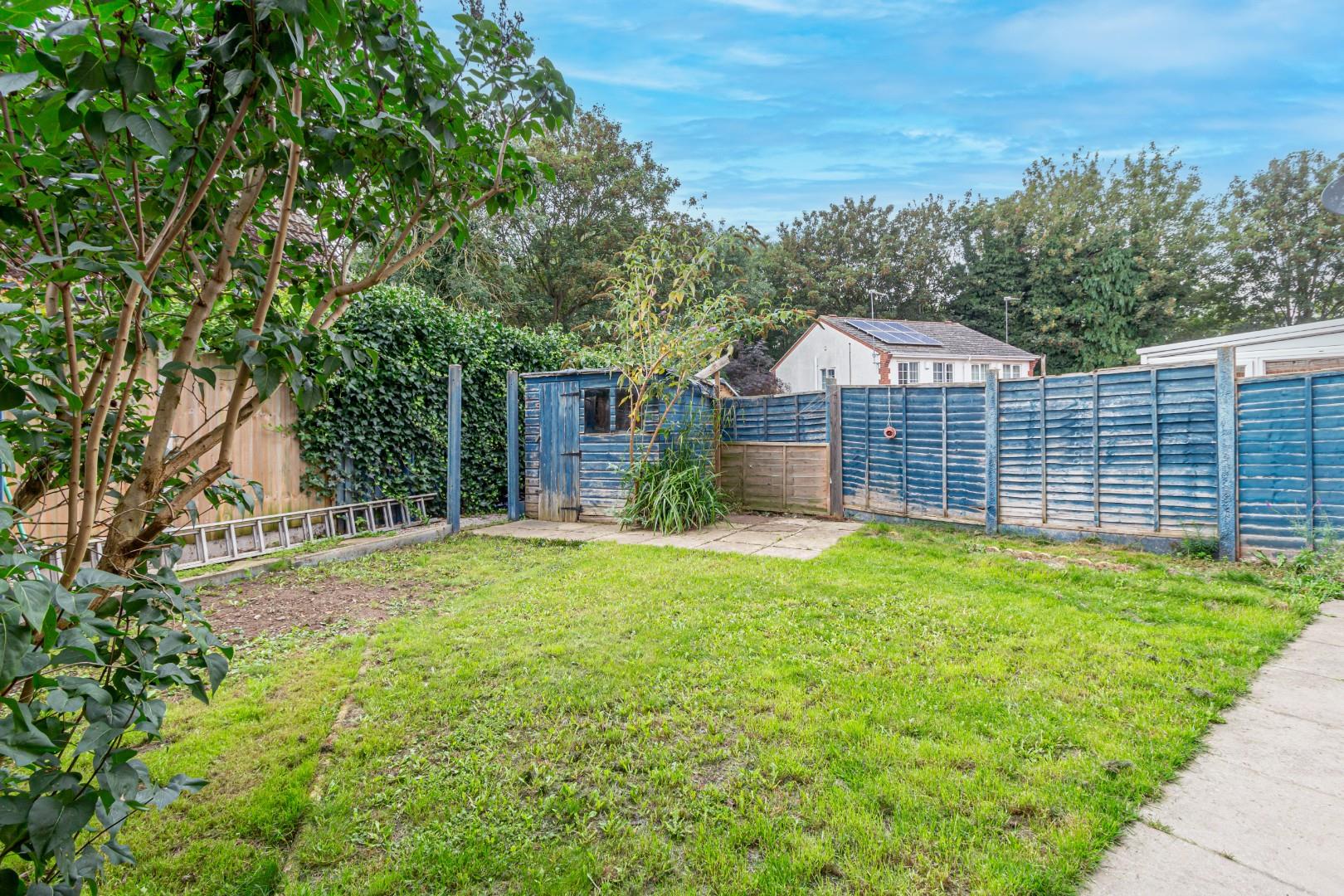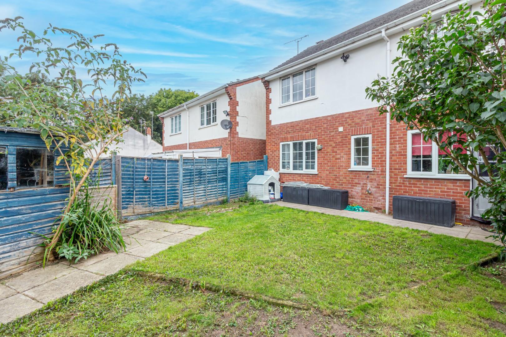 Secluded rear garden with patio area to front and lawn
