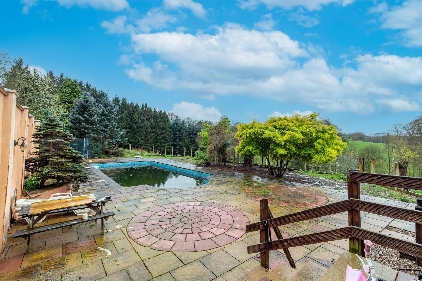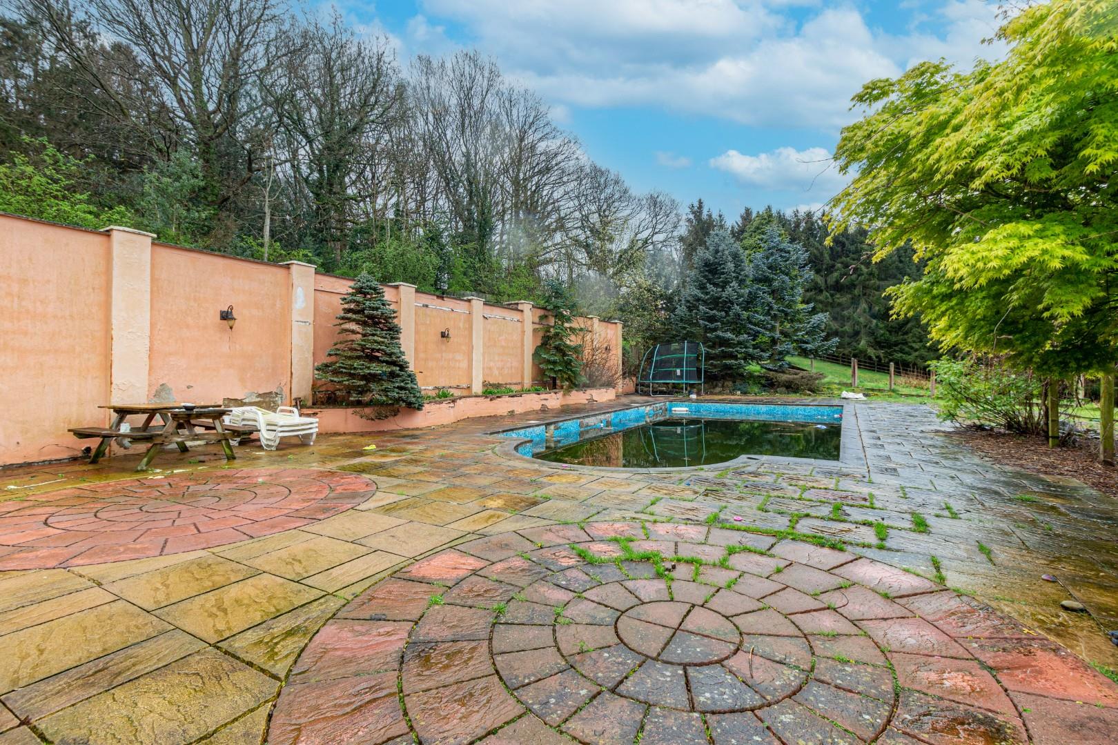 With paved surround, mosaic style tile surround, steps to enter. Please note that the pool is in need of maintenance before being deemed safe to use. Buyers should seek a survey of the swimming pool before commissioning its use.