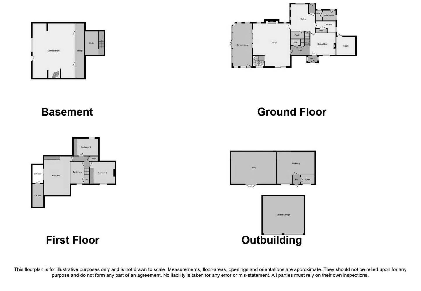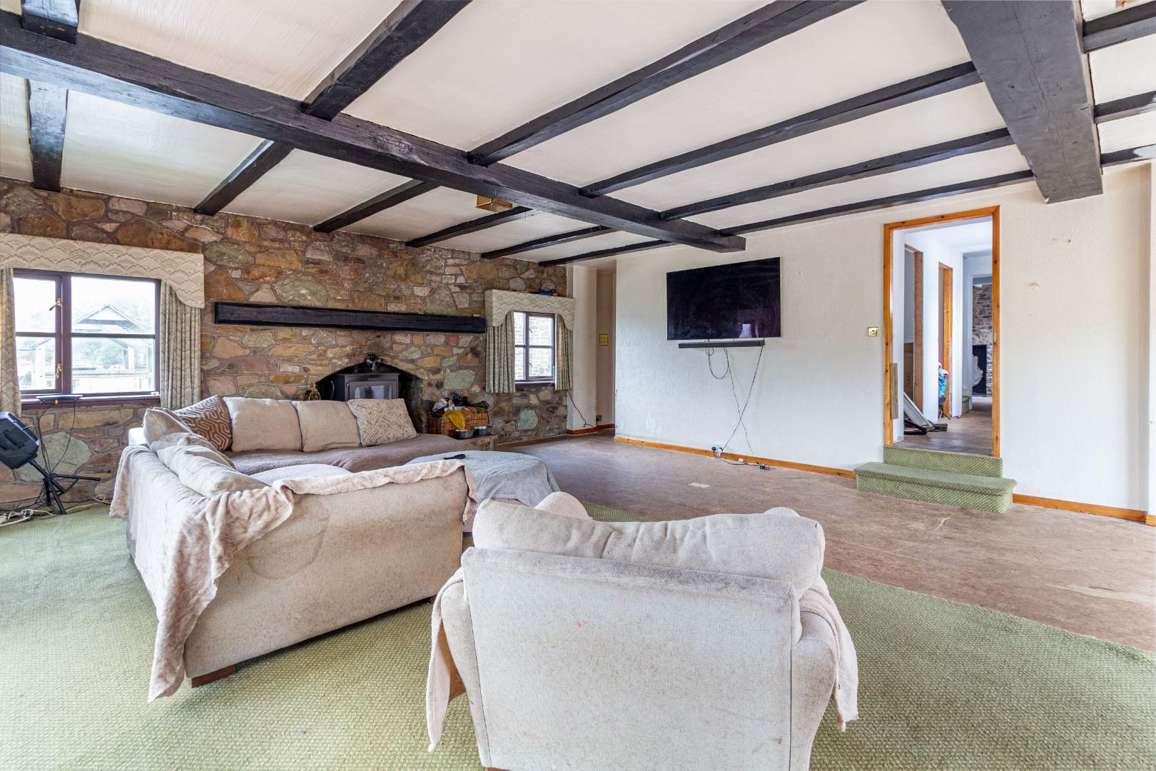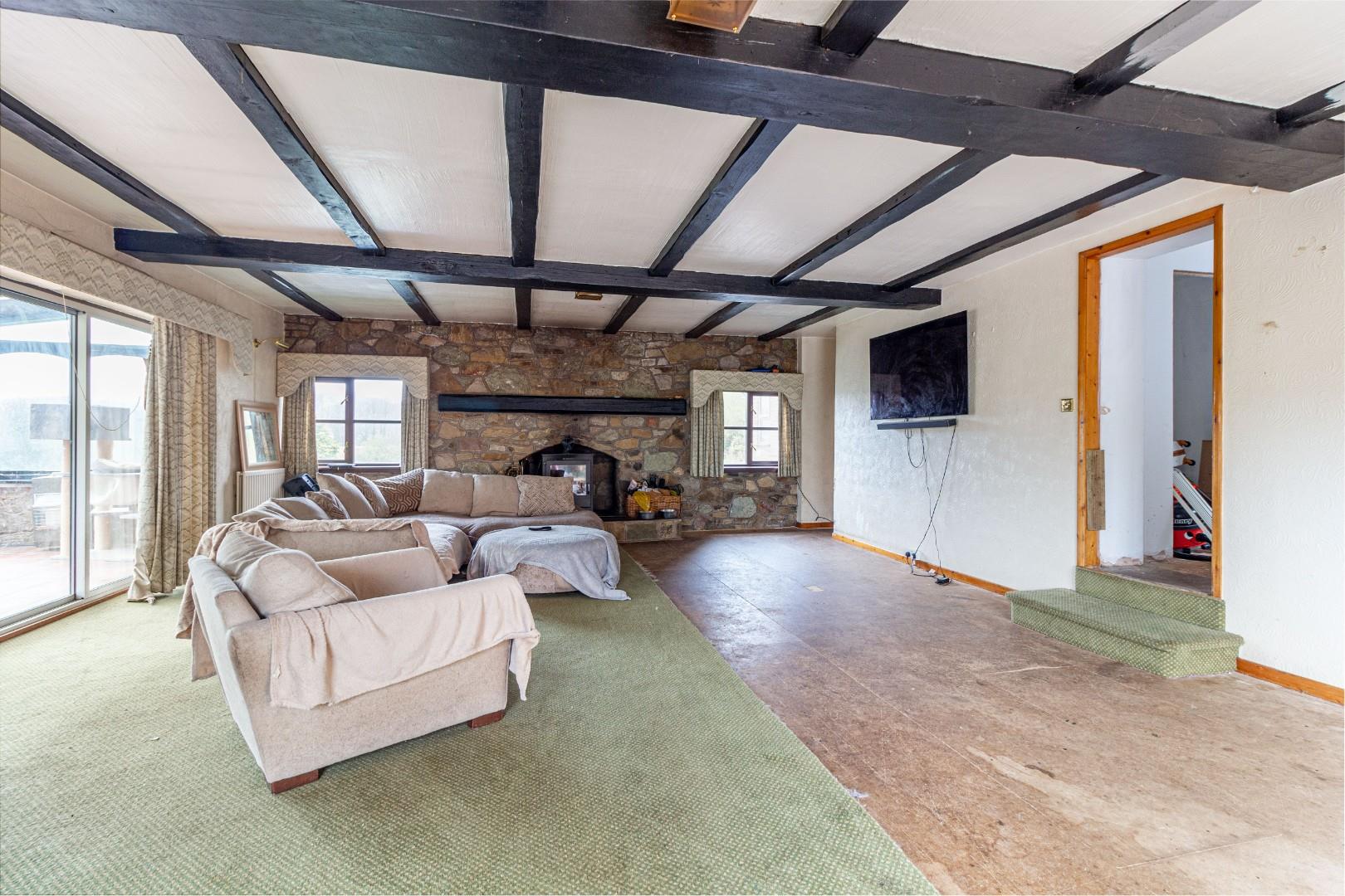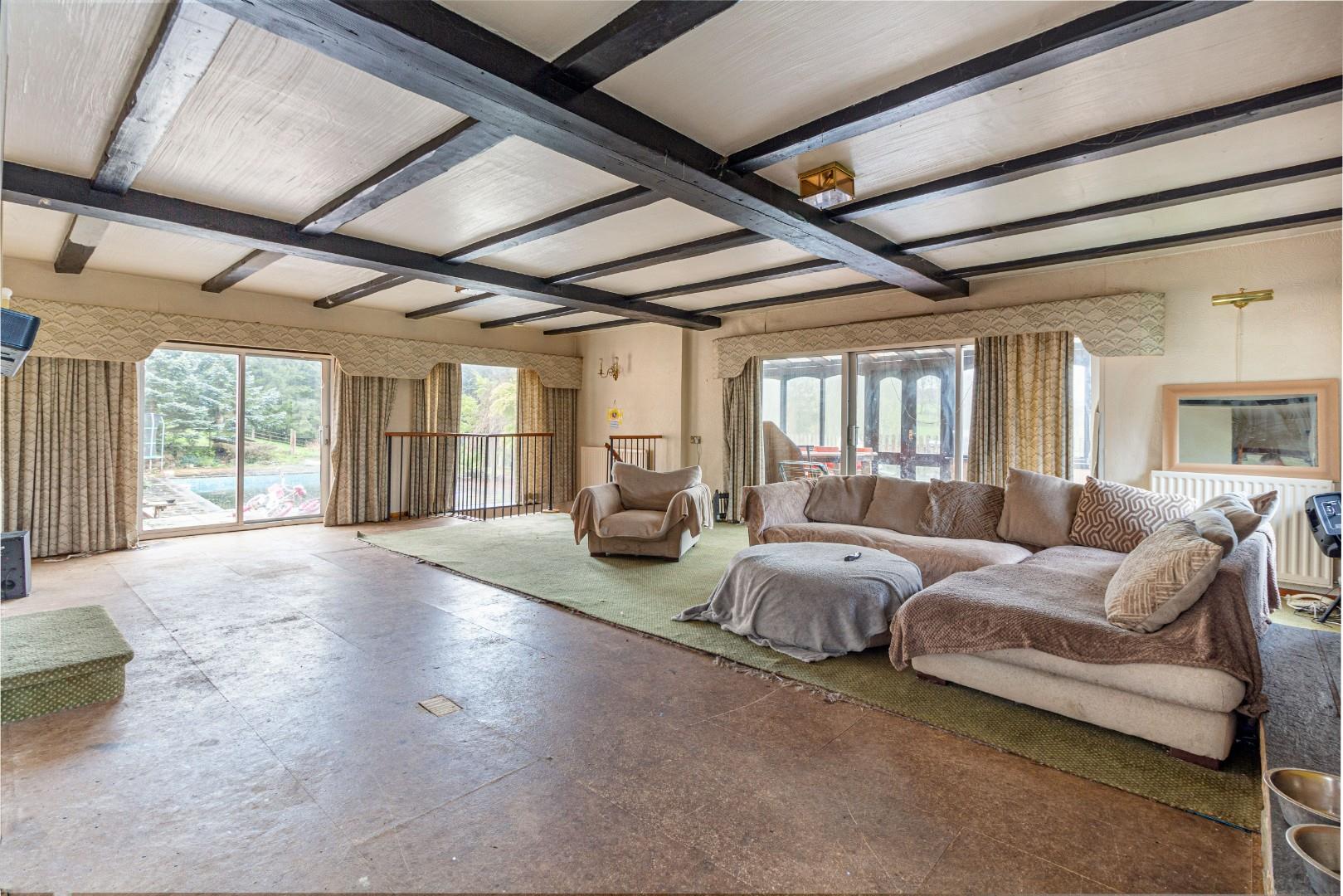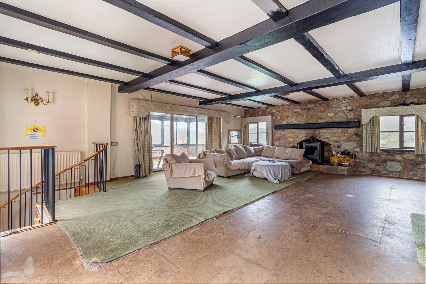 With doors leading from the kitchen and dining room, doors leading to the pool area and conservatory, stone fireplace with solid fuel burning stove with decorative timber beam above, stairs descending to the lower floor accommodation and central heating radiators