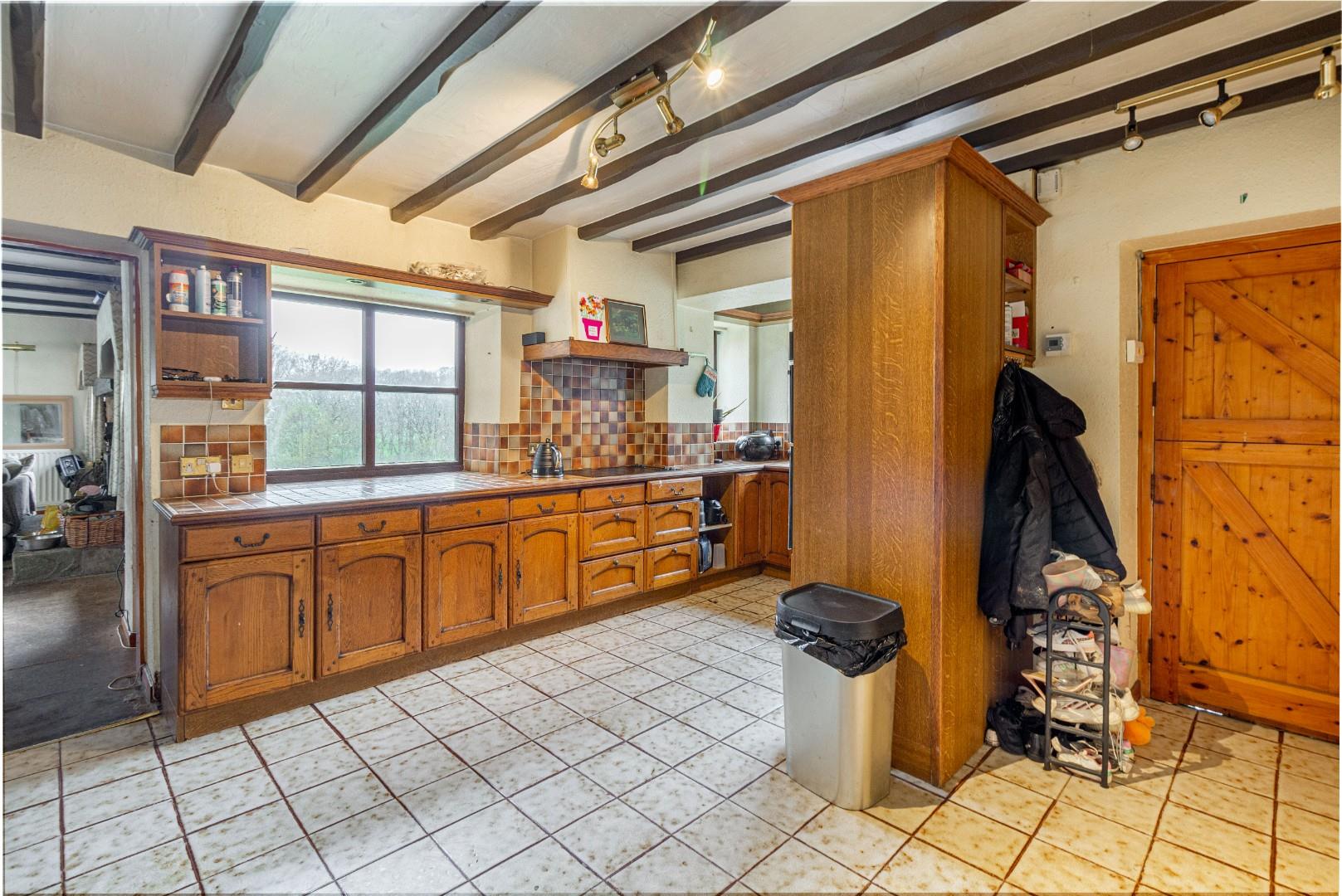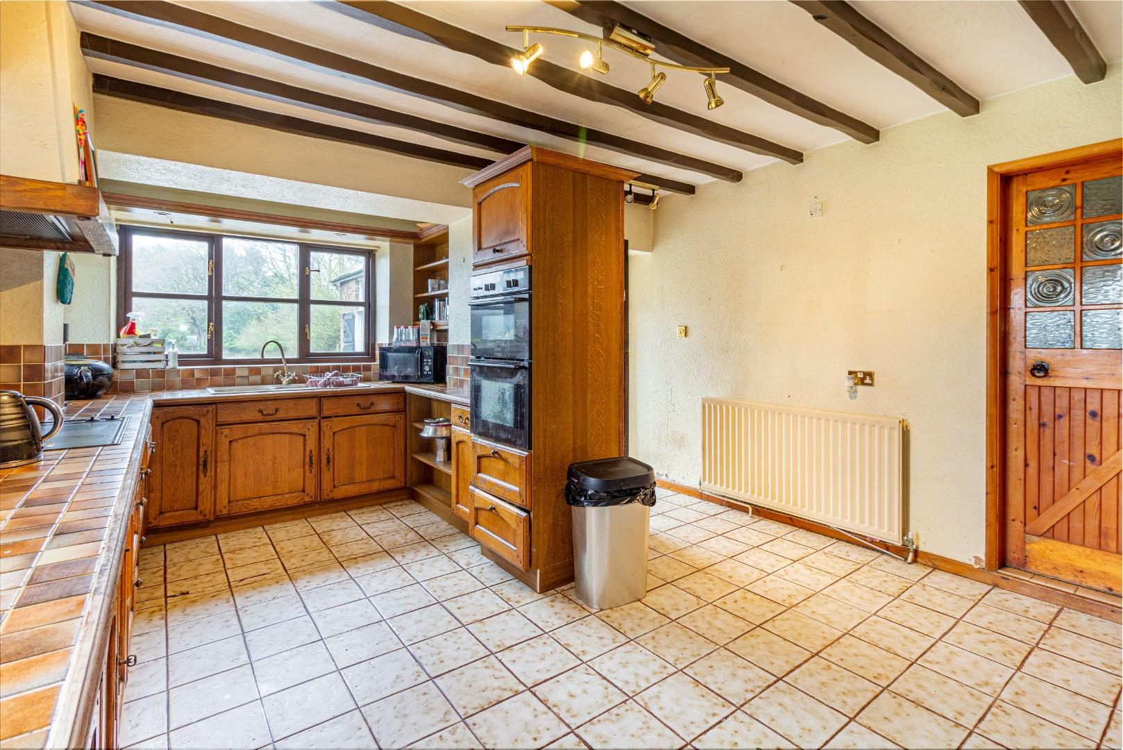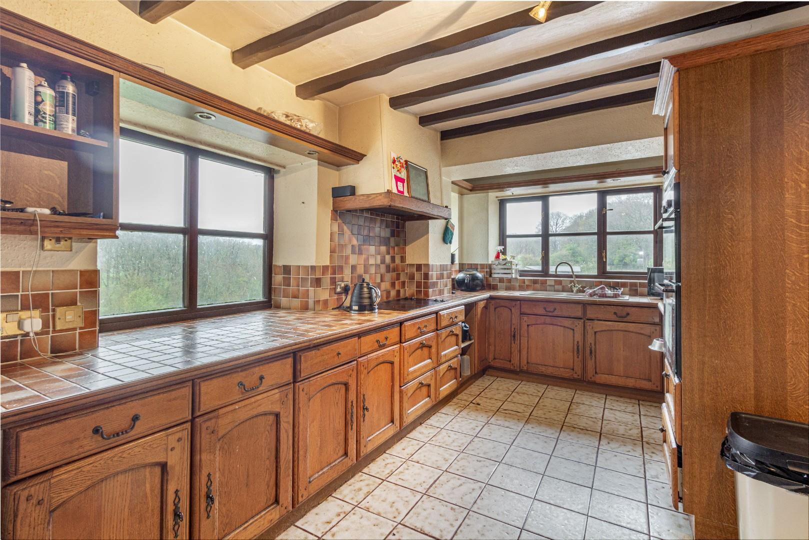 With a door leading from the dining room, fitted with a range of wall and base units with tiled worktops and splashbacks above, integrated double oven, ceramic sink with mixer tap, a central heating radiator and windows to multiple aspects