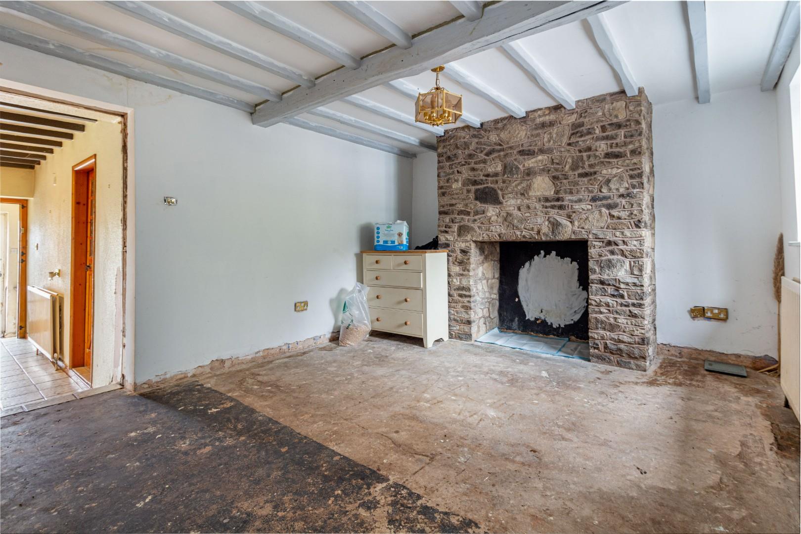 With a door leading from the front porch, fireplace with stone surround, window to the front and a central heating radiator