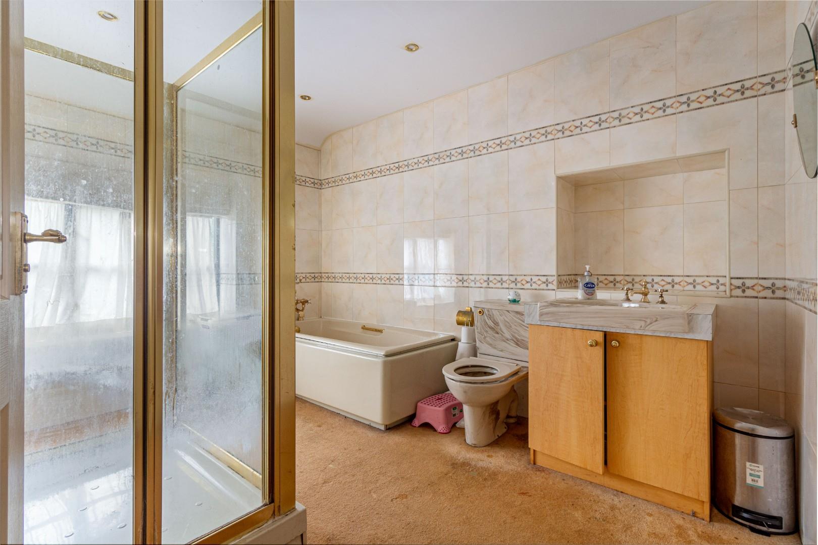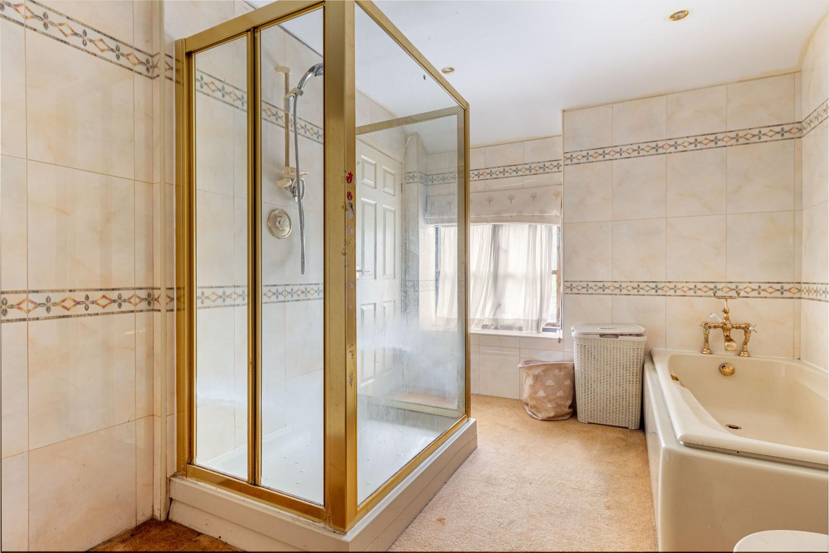 With a door leading from the landing, tiled surround with shower cubicle, separate bath, hand wash basin, WC, a central heating radiator and window to the rear