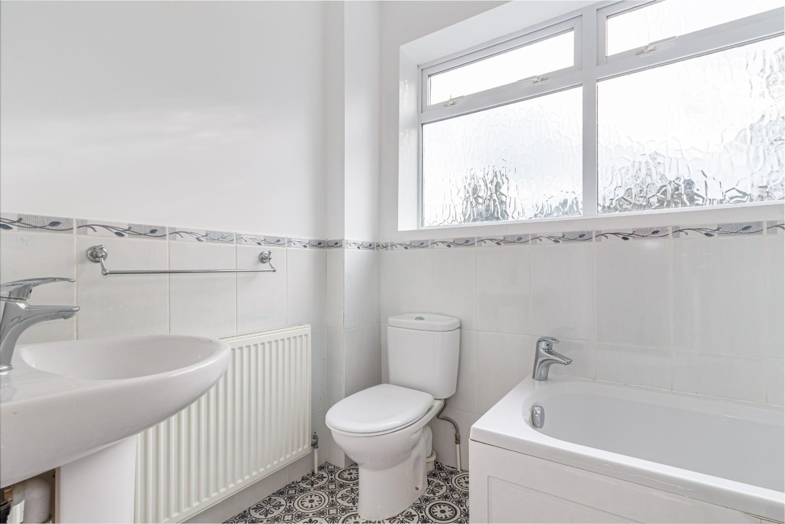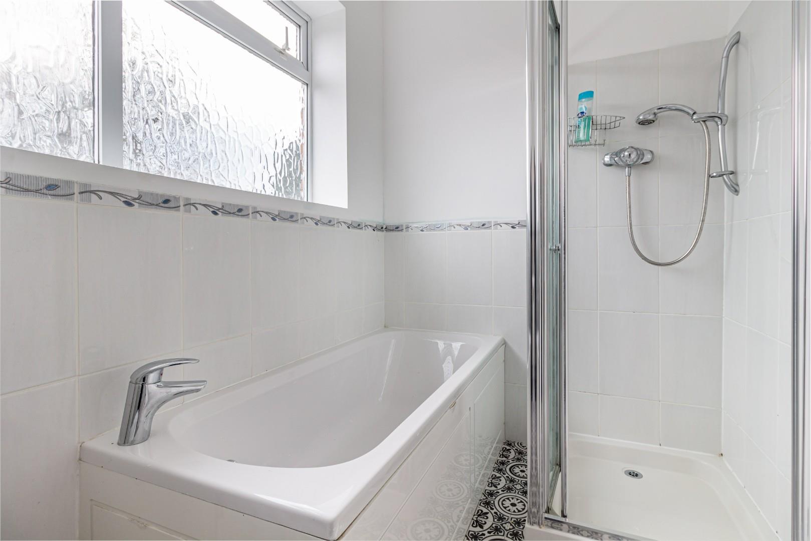 With a door leading from the landing, WC, hand wash basin, bath with tiled surround, corner shower cubicle with mixer shower, a double glazed window to the rear and a central heating radiator