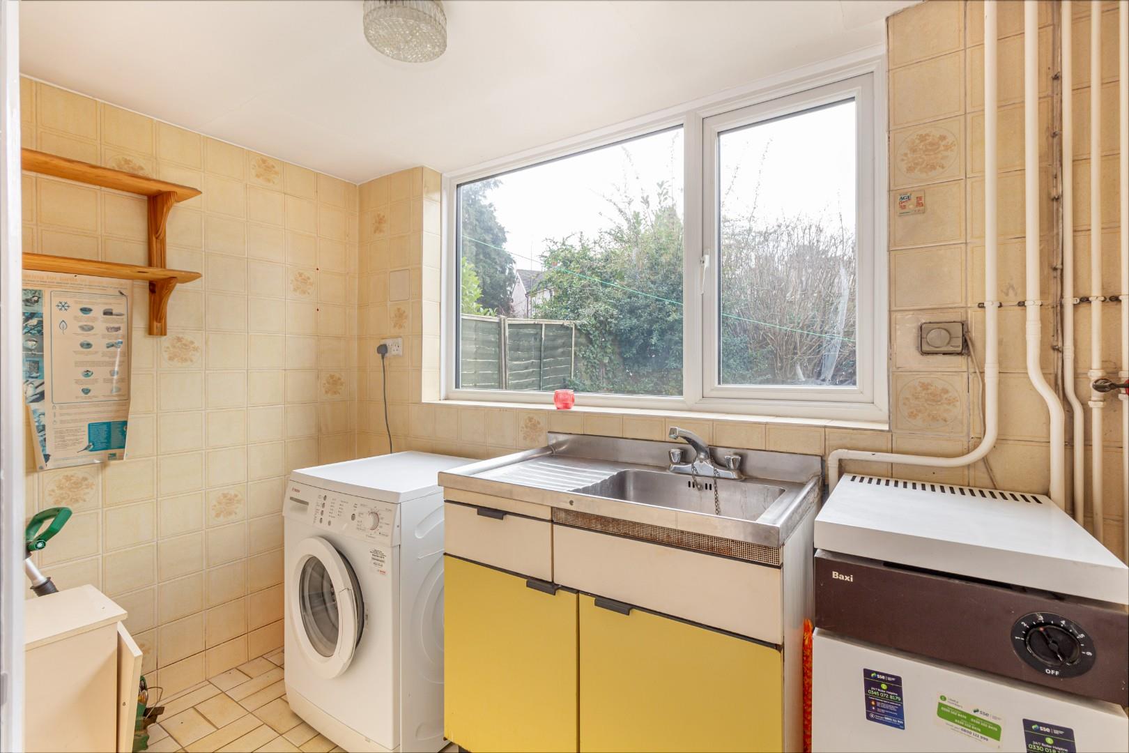 With a door leading from the kitchen, utility outlet points for laundry machinery, stainless steel sink with mixer tap and a double glazed window to the rear garden