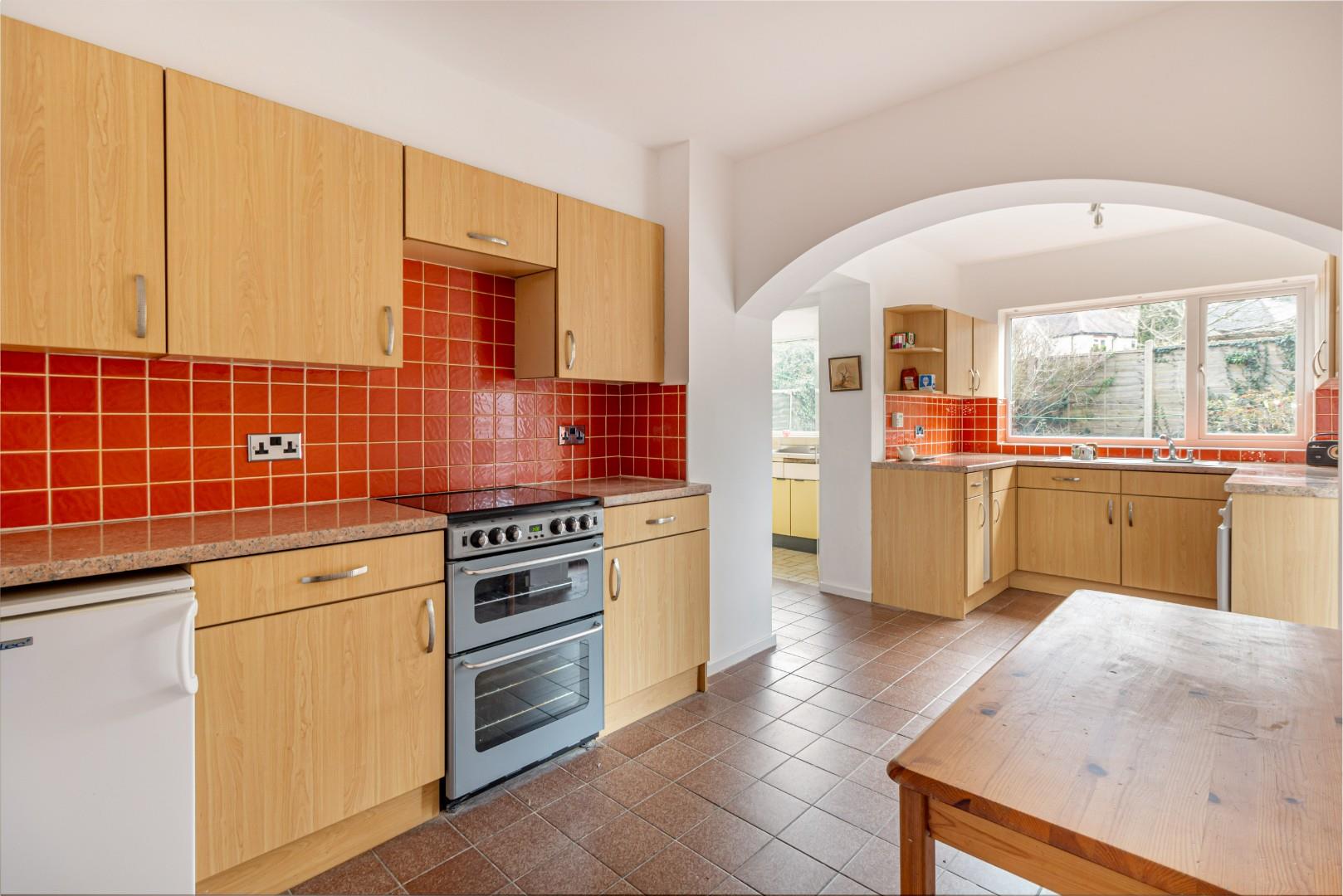 With doors leading from the dining room and entrance hall, fitted with a range of wall and base units with worktops above, stainless steel sink with mixer tap, utility outlet points, a double glazed window to the rear, a central heating radiator and doors leading to the rear garden, utility room and garage