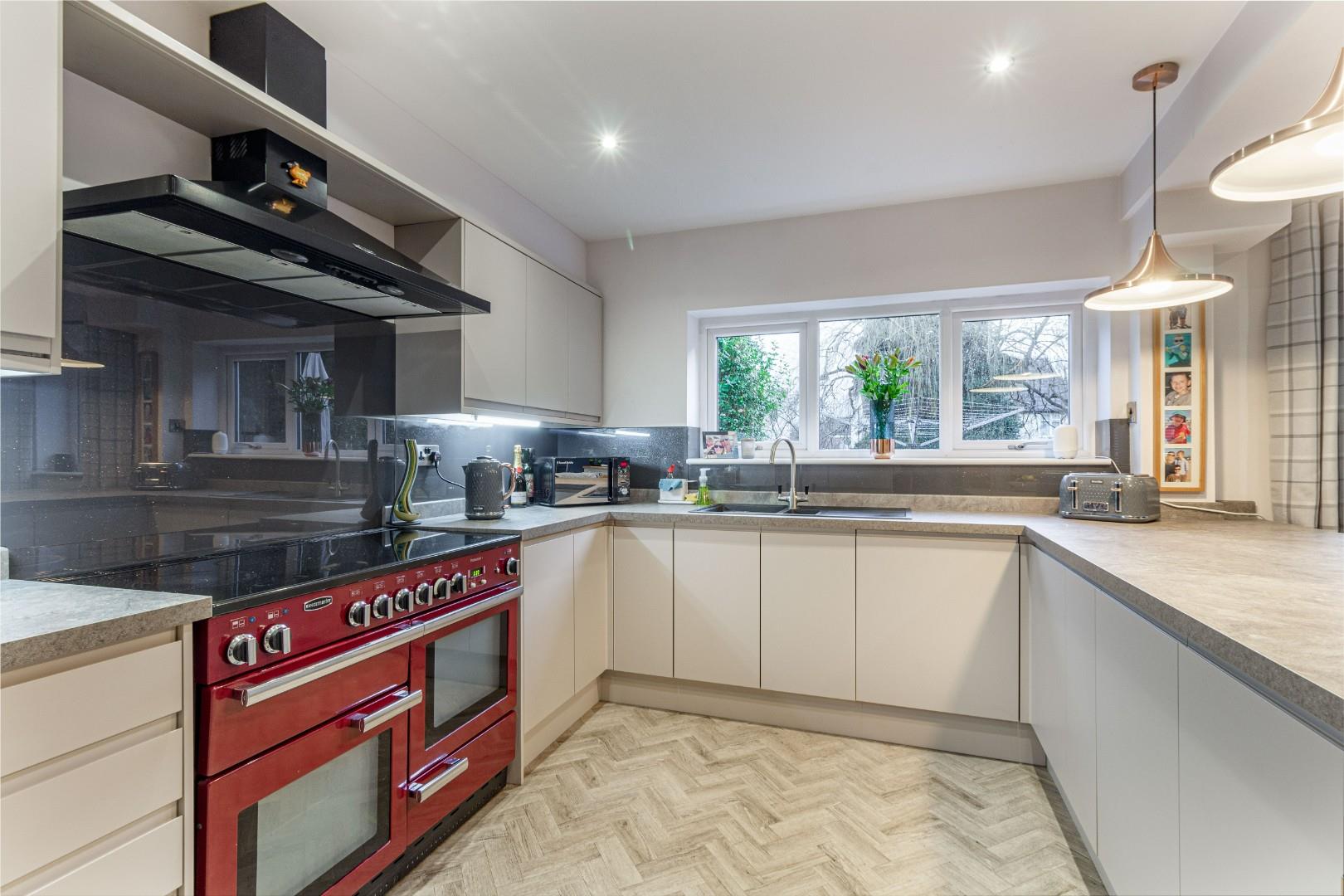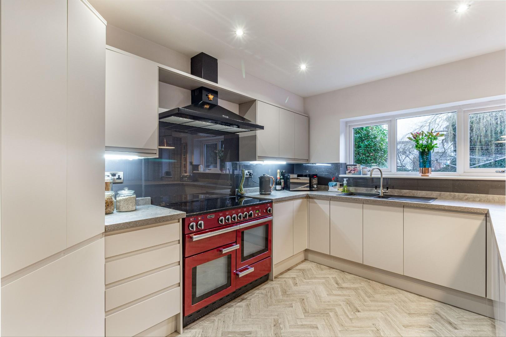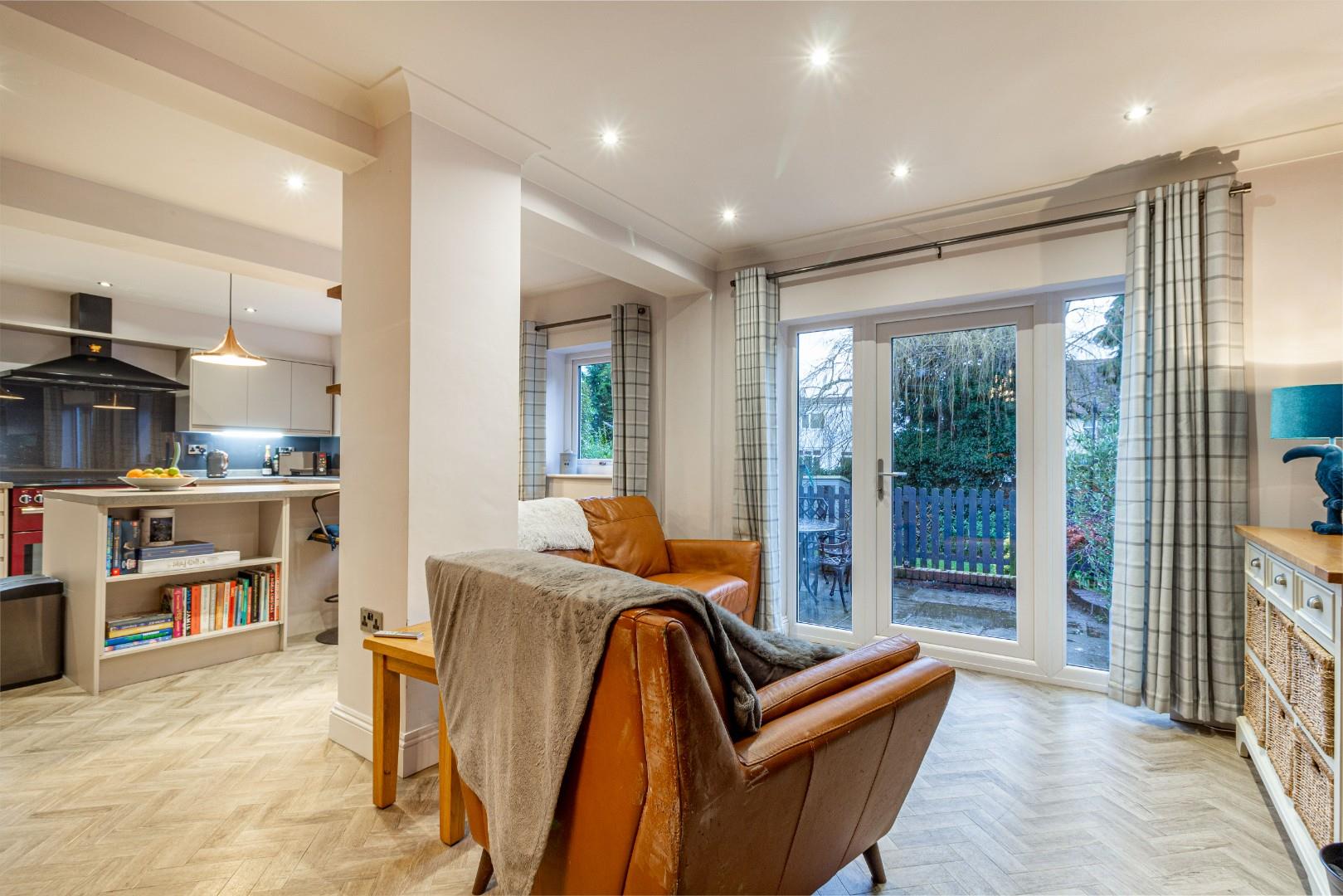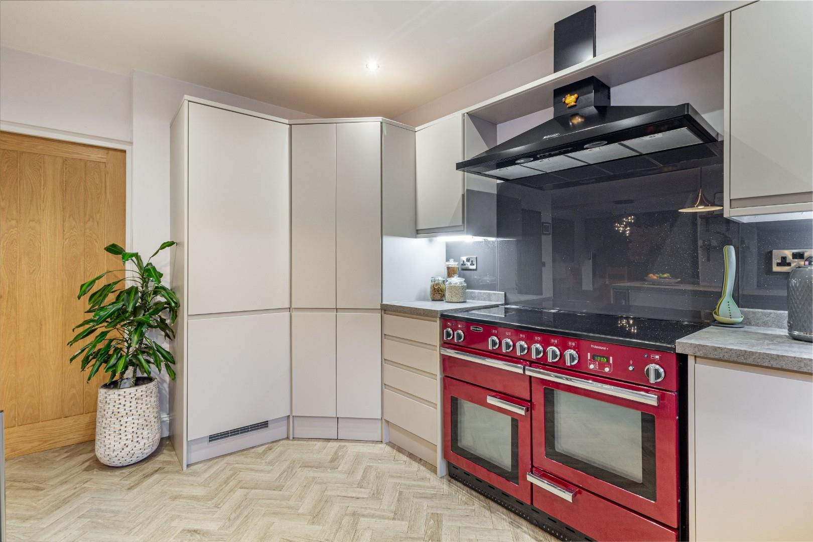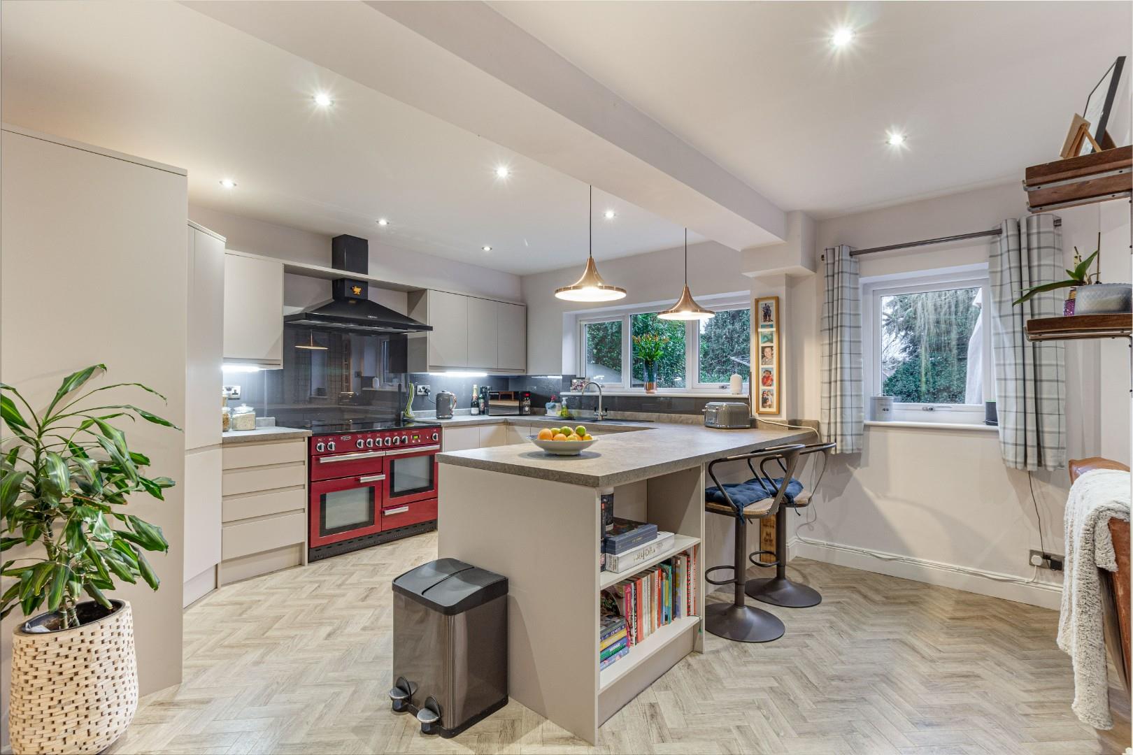 With a door leading from the entrance hall, the kitchen features a range of wall and base units with worktops. integrated appliances, range cooker with extractor above, composite sink with mixer tap, peninsular breakfast bar with lighting above, a double glazed windows to the rear and a UPVC double glazed door leading to the garden. The lounge area (open plan to the kitchen) features a log-burning stove, double glazed doors to the rear garden and central heating radiators
