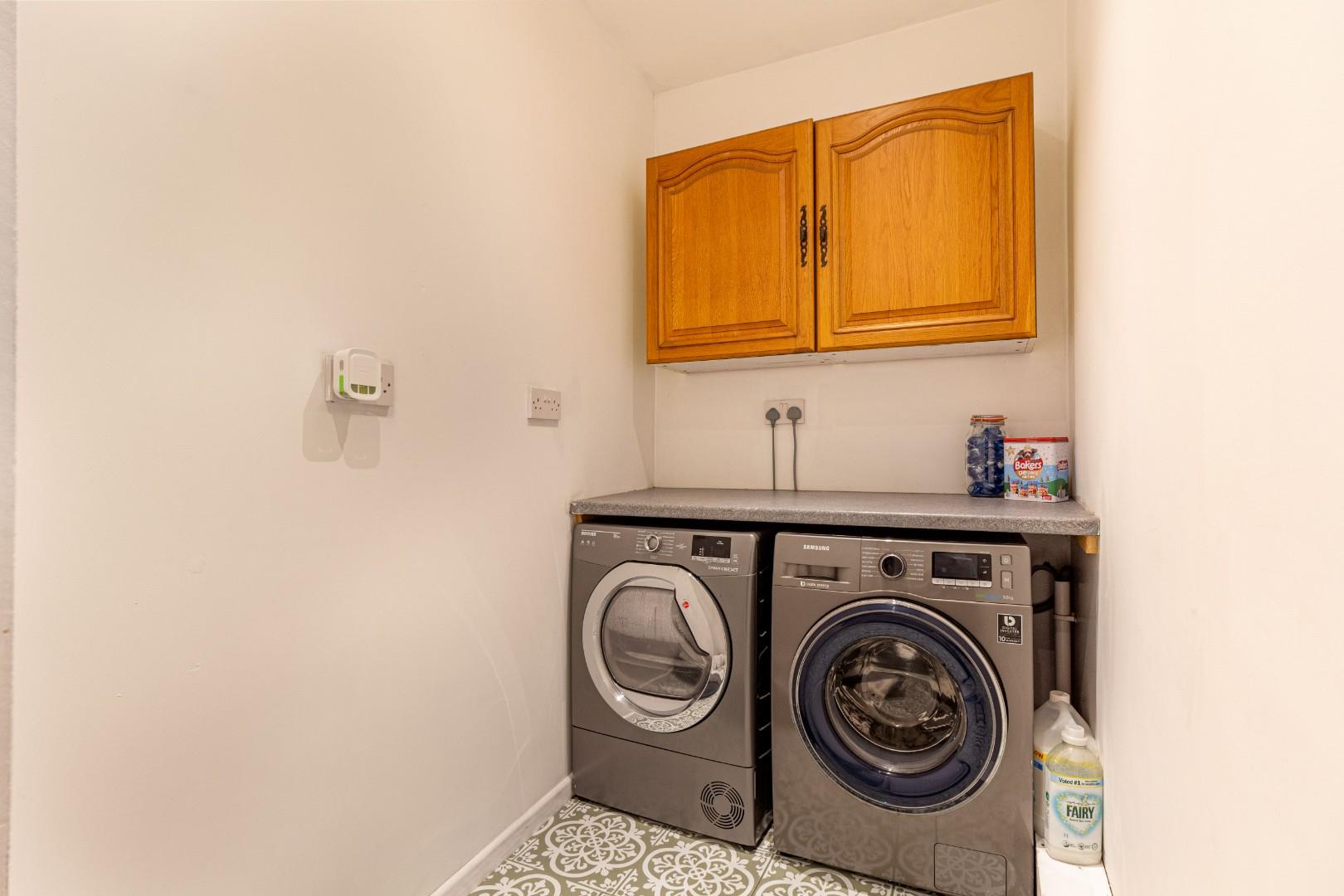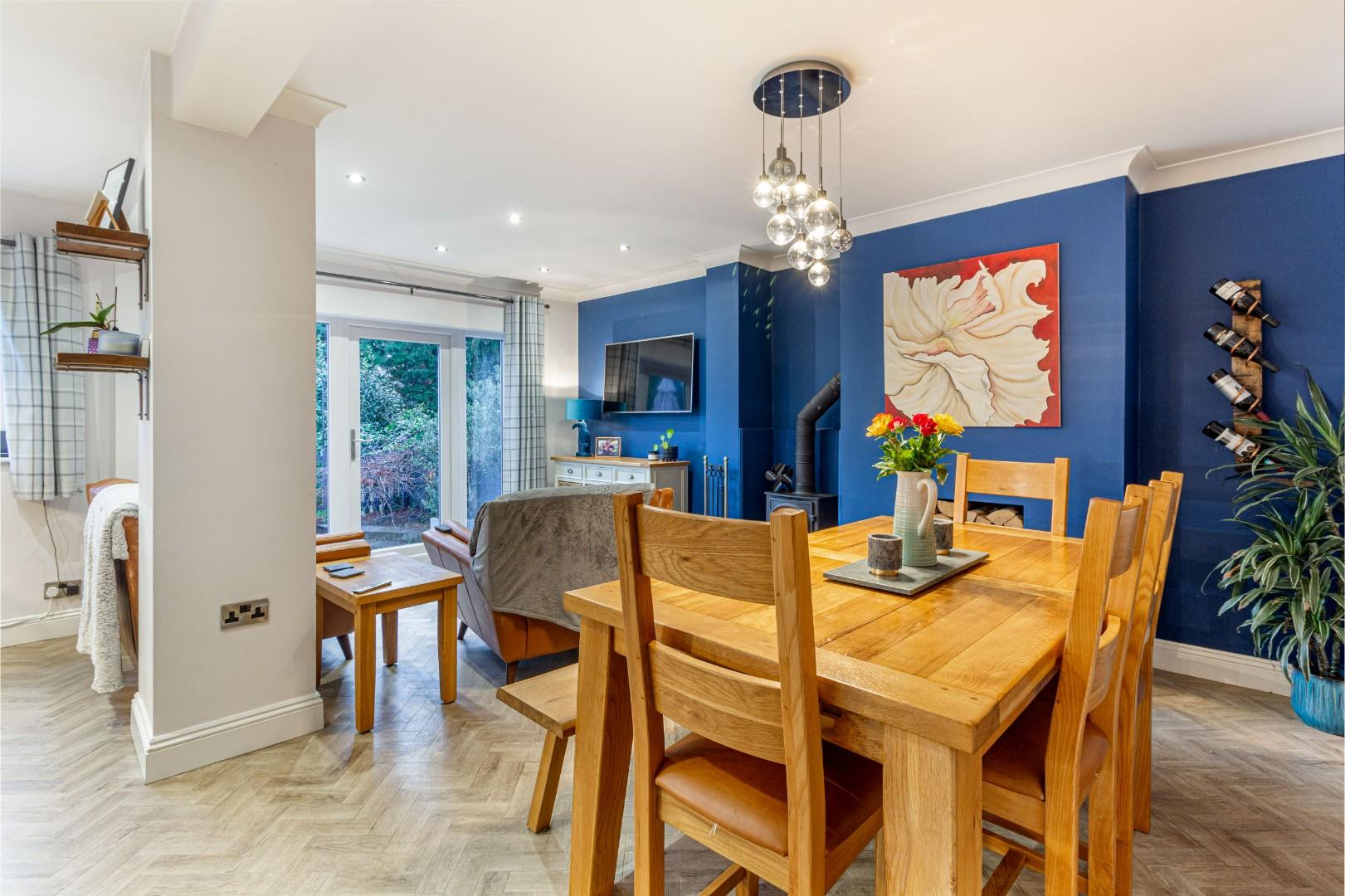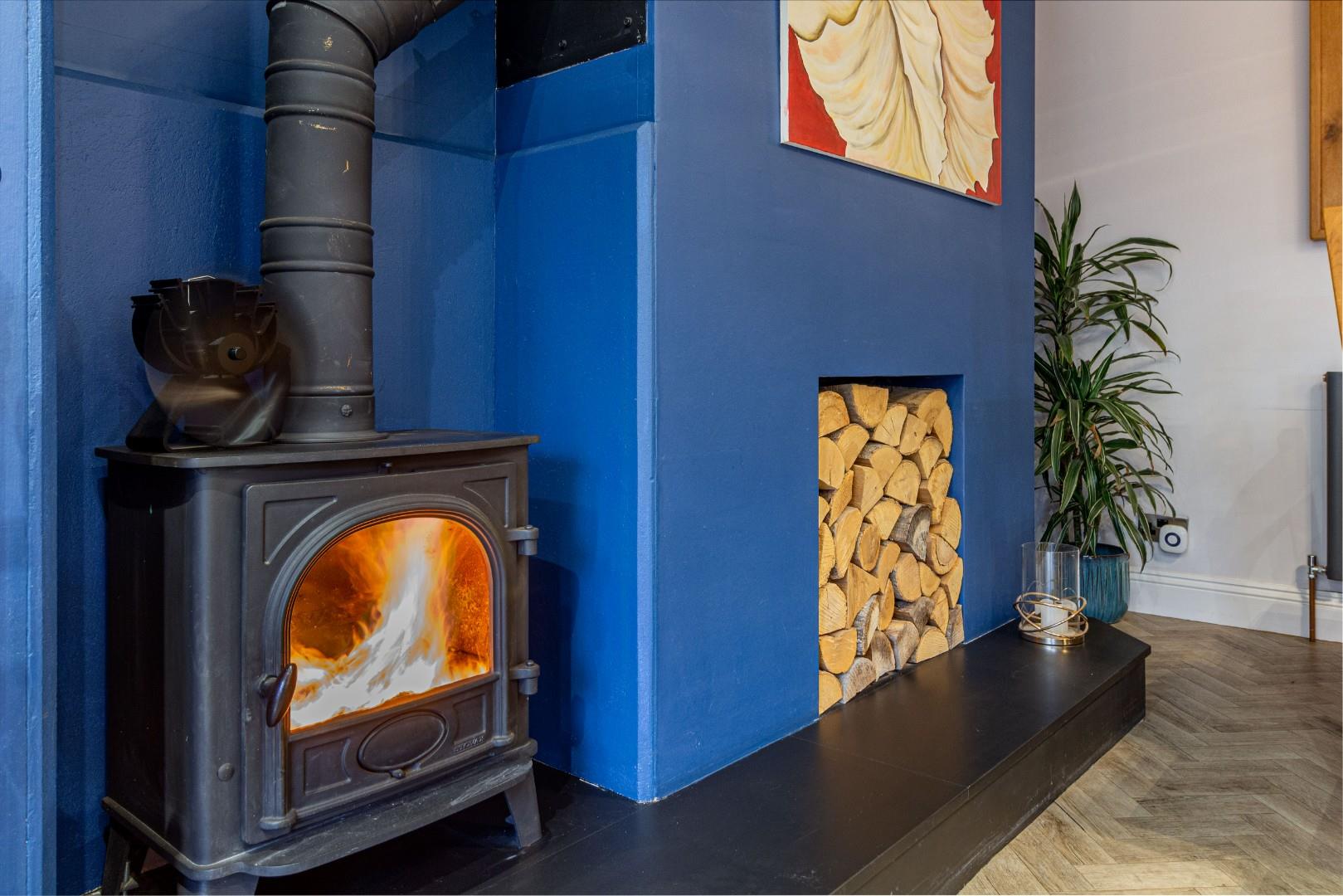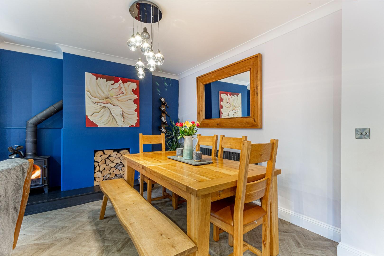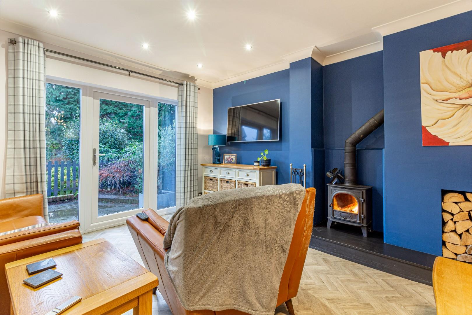 As you step in, the property unveils a modern and spacious open-plan kitchen featuring an island, seamlessly blending into a lounge/diner area adorned with the warmth of a log-burning stove. Just off the kitchen, discover a practical utility room and access to the garage/store. To the front, a further lounge with a double-glazed bay window creates an additional cosy space.