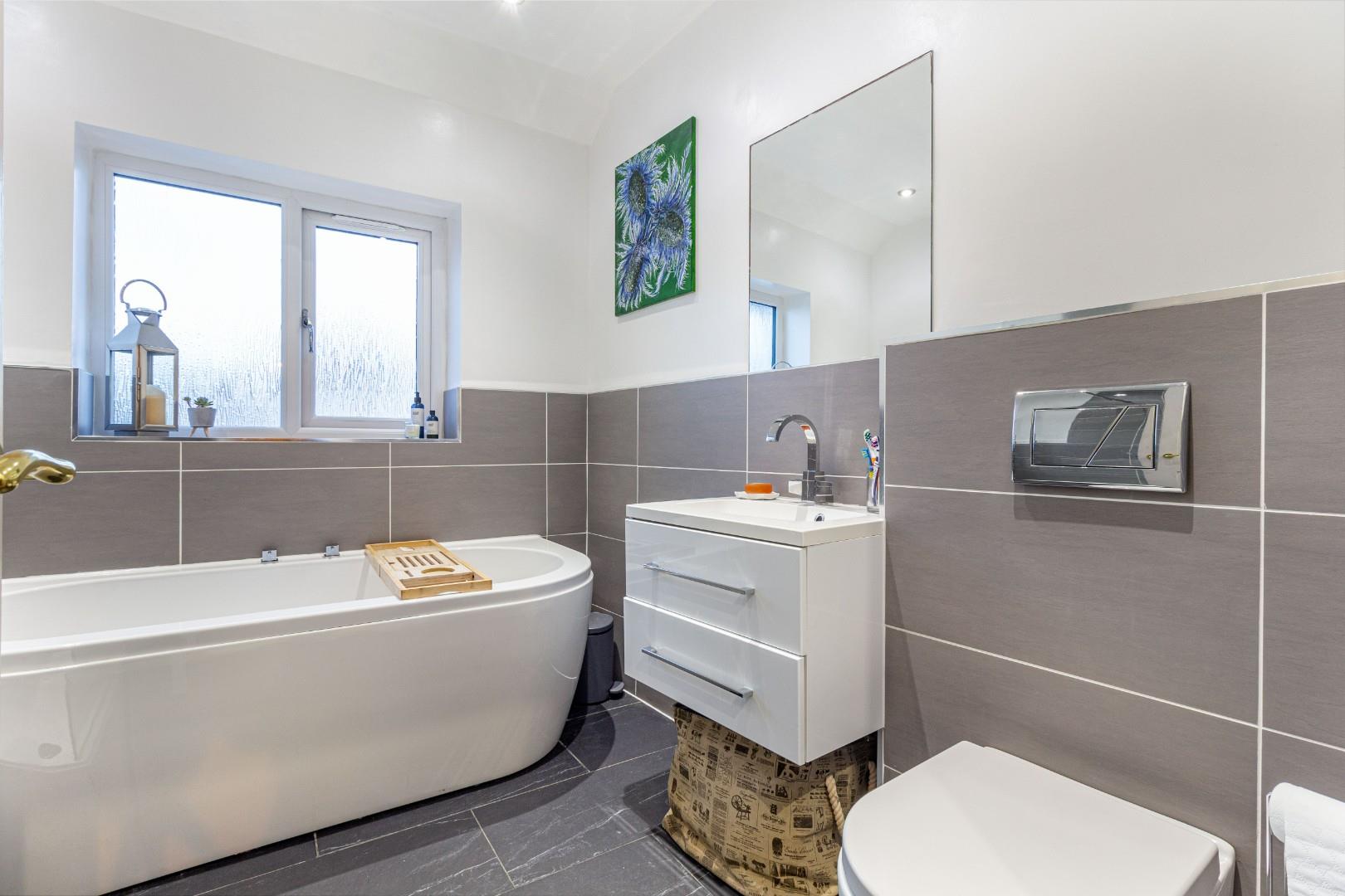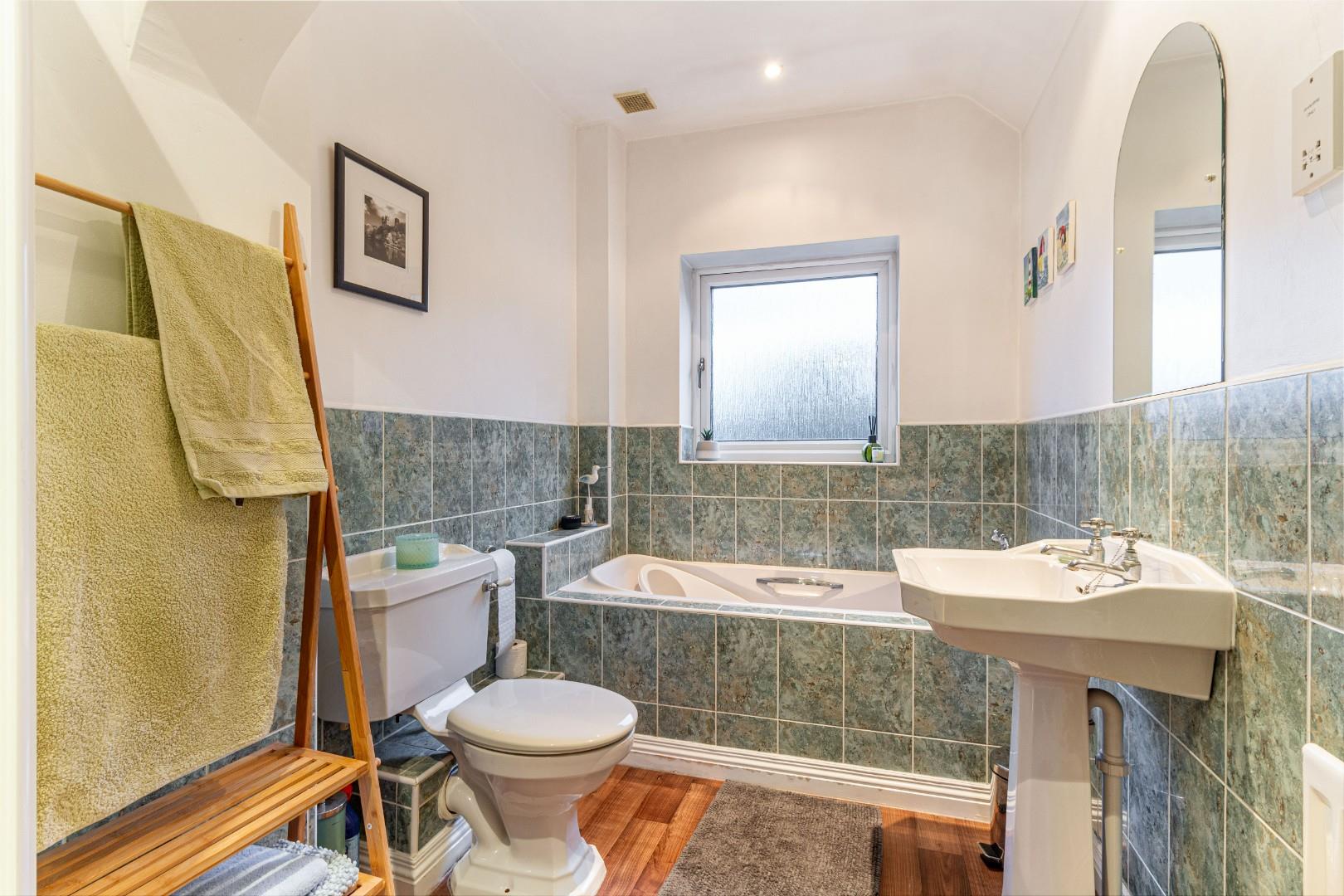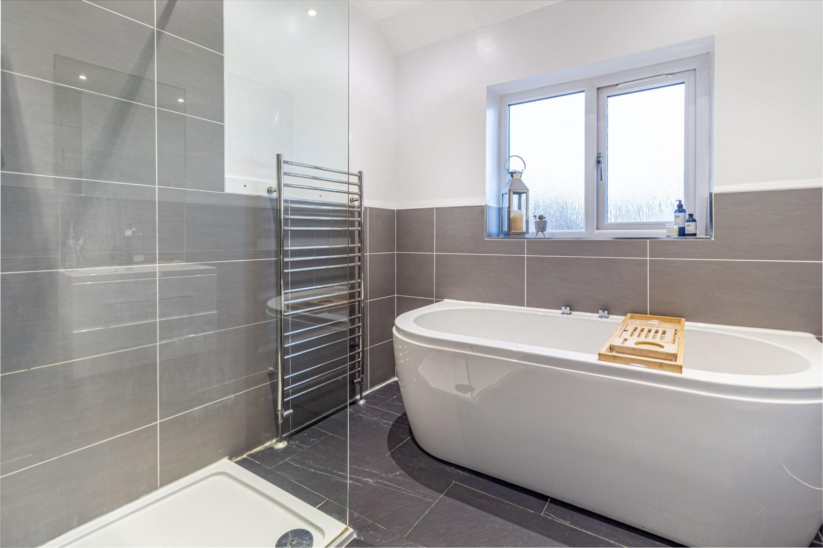 With a door leading from the landing, fitted with tiled surround, WC, hand wash basin and bath, separate tiled shower cubicle, a central heating radiator and a double glazed window to the rear