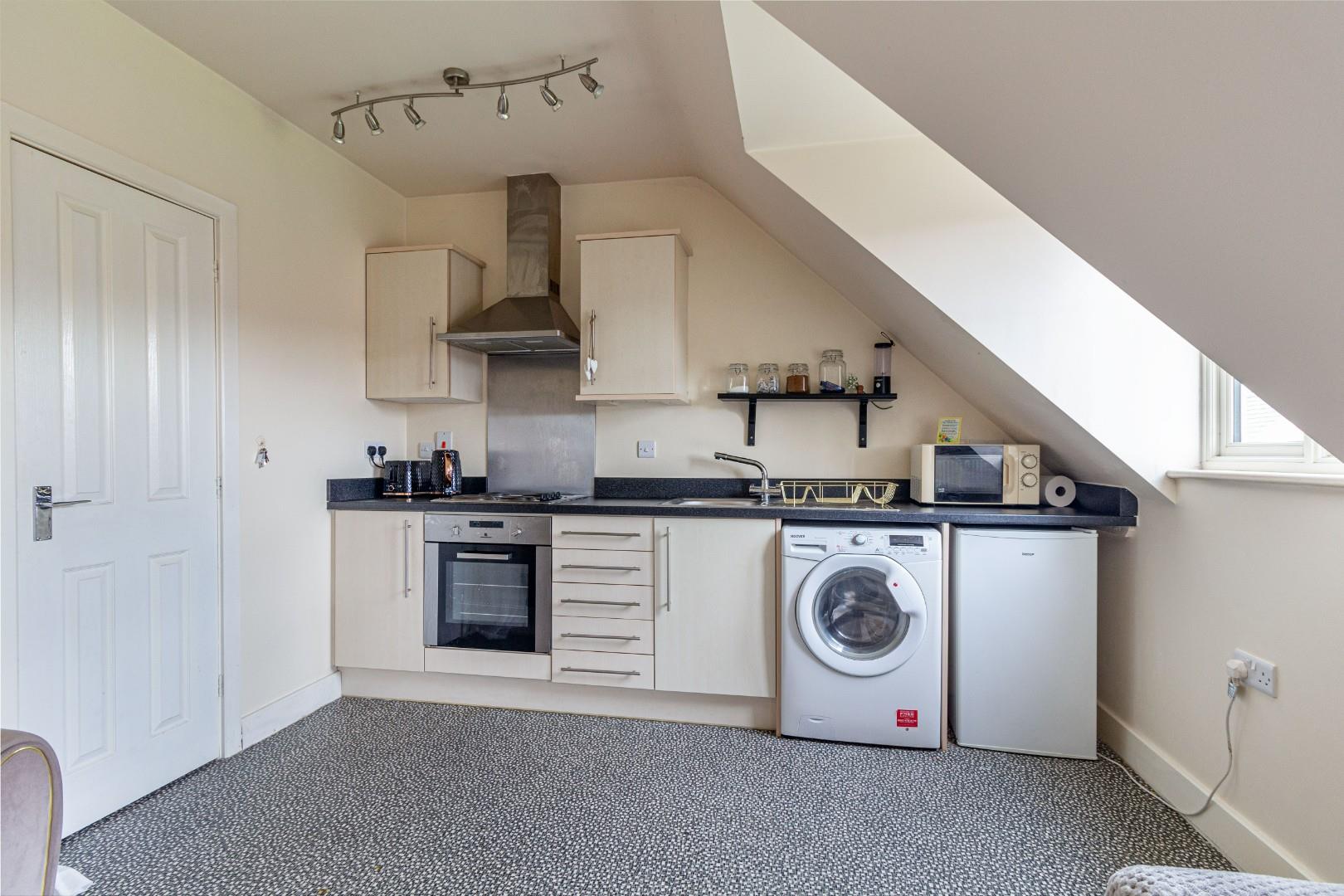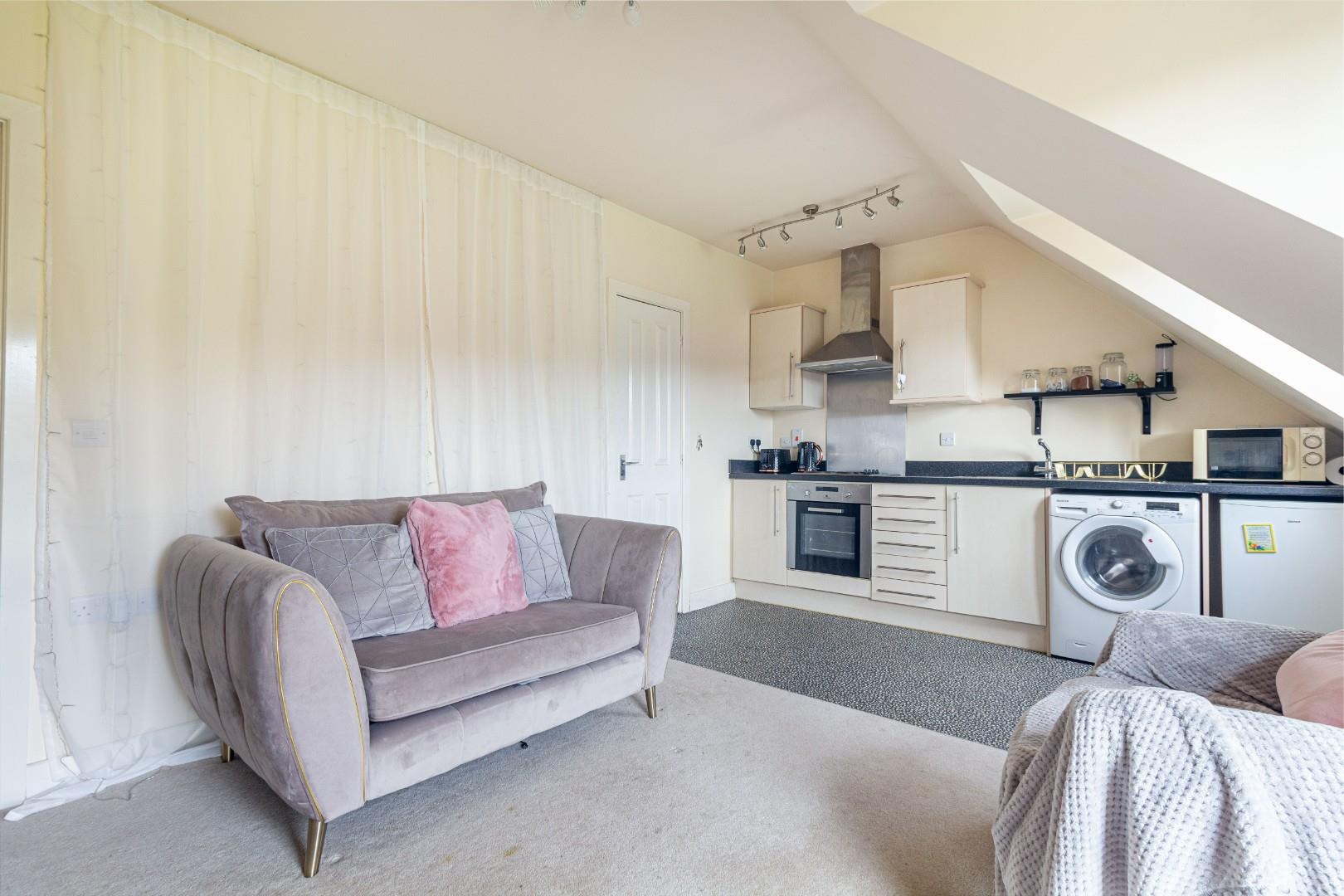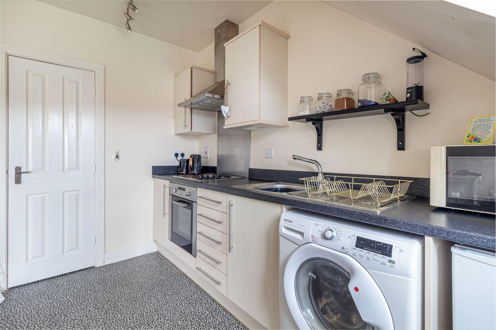 Upon entry, you’re welcomed into an inviting space featuring an entrance hall. The open-plan living room and kitchen boast a thoughtfully planned layout, including a dining table with four chairs, fridge/freezer, washing machine, oven, hob, and extractor fan.