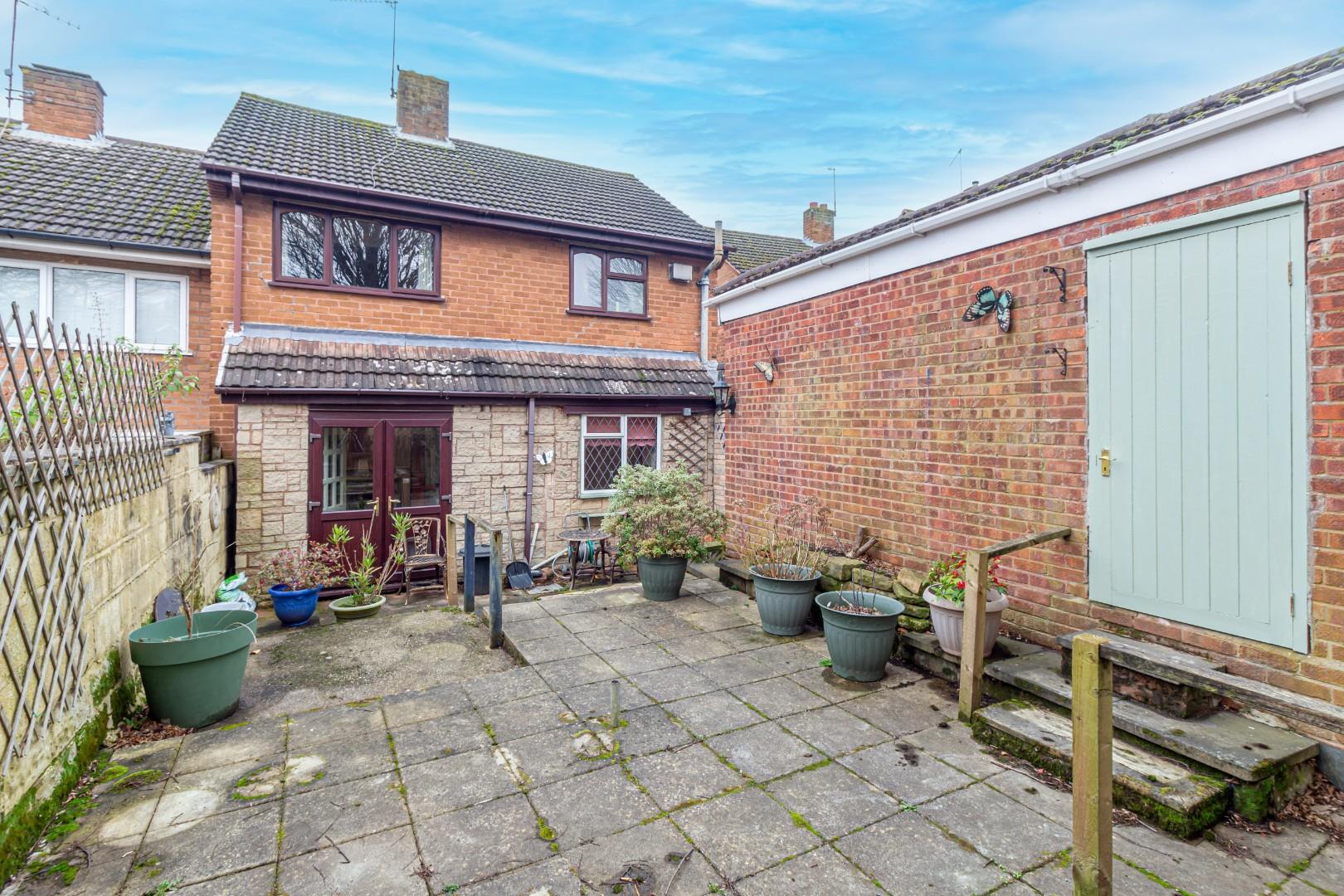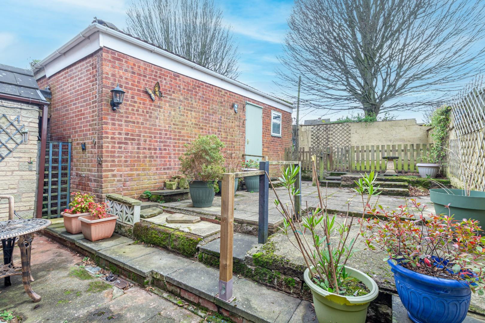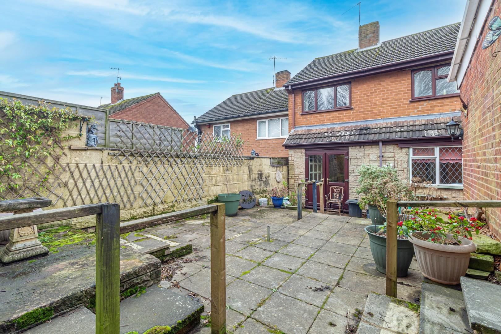 With a patio area to the front and steps leading to further patio beyond with shrub borders, doorway access to the garage