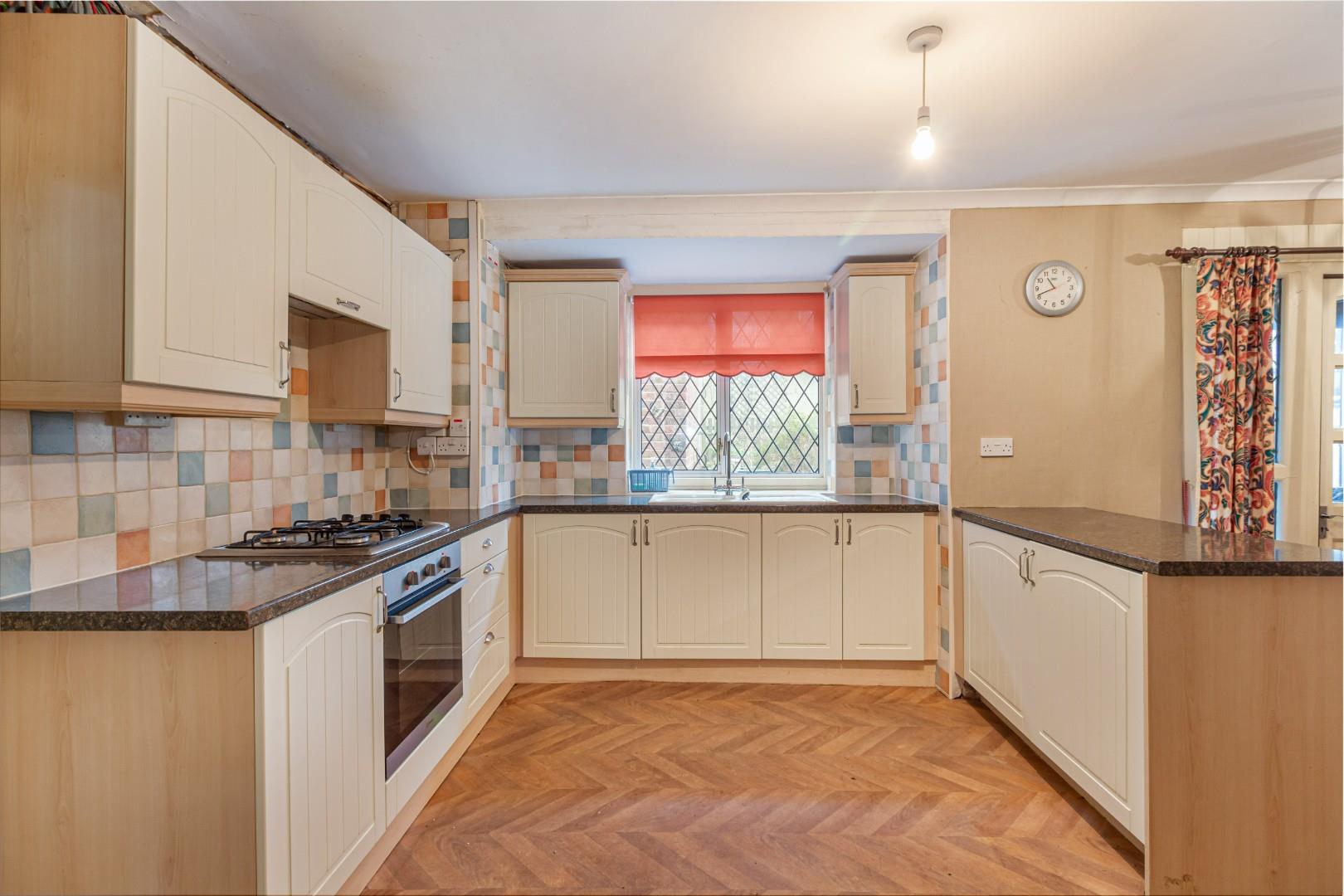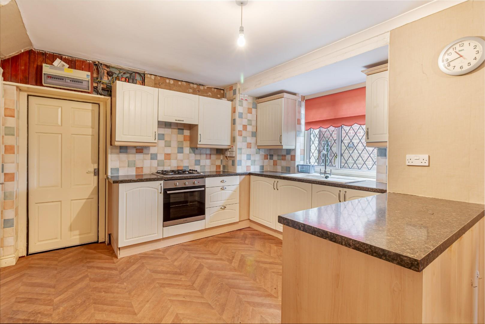 With a door leading from the entrance hall, fitted with a range of wall and base units with worktops, tiled splashback, integrated oven and hob, sink with mixer tap, a double glazed window to the rear, doors leading to the rear garden and a central heating radiator