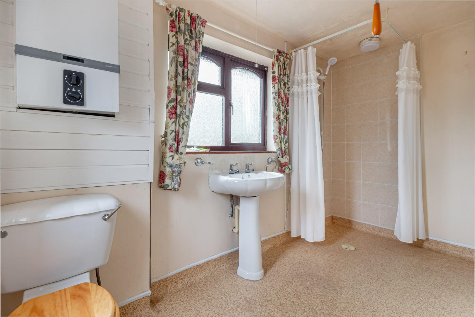 With a door leading from the landing, WC, hand wash basin, shower with curtain rail, a central heating radiator and double glazed window to the rear