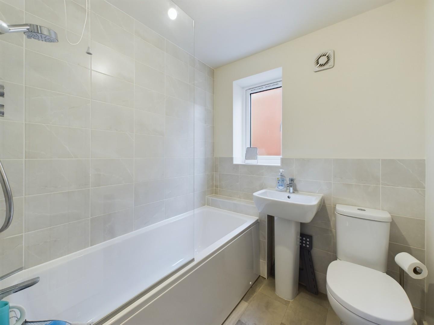 With a door leading from the landing, fitted with tiled surround, WC, hand wash basin, bath with shower over, a double glazed window to the side and a central heating radiator