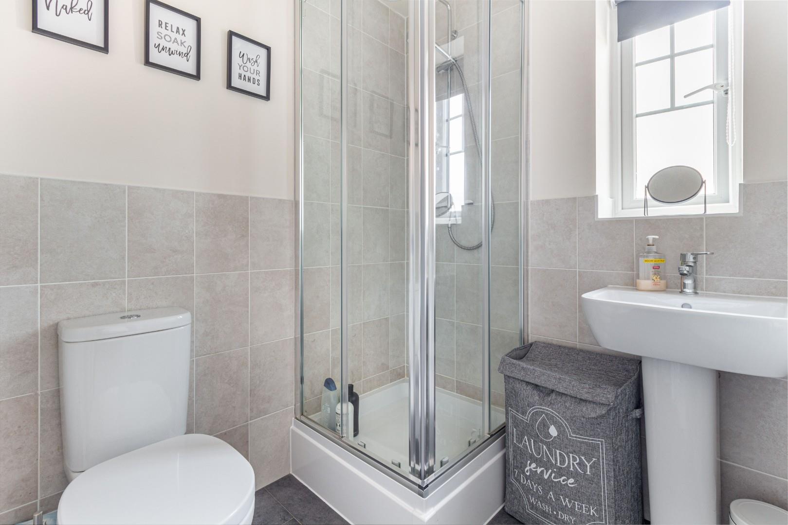With a door leading from the master bedroom, tiled surround with WC, hand wash basin, shower cubicle, a double glazed window to the front and a central heating radiator
