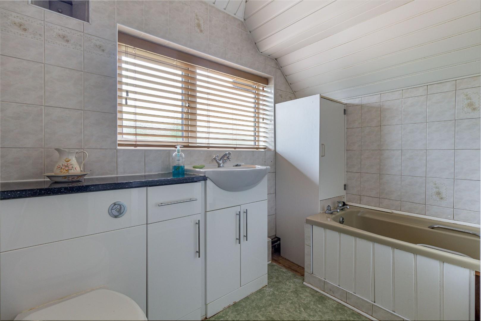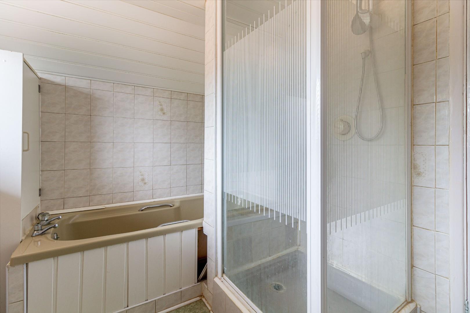 With a door leading from the landing, tiled surround with WC, hand wash basin with mixer tap, shower cubicle with tiled surround, bath unit, double glazed window to the rear and a central heating radiator