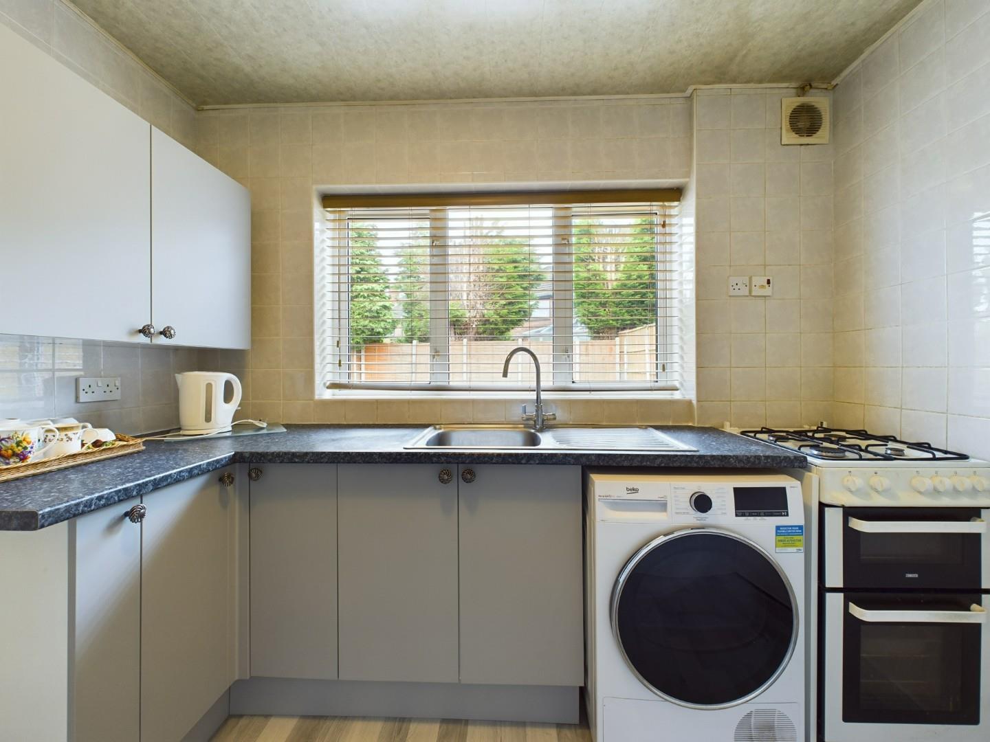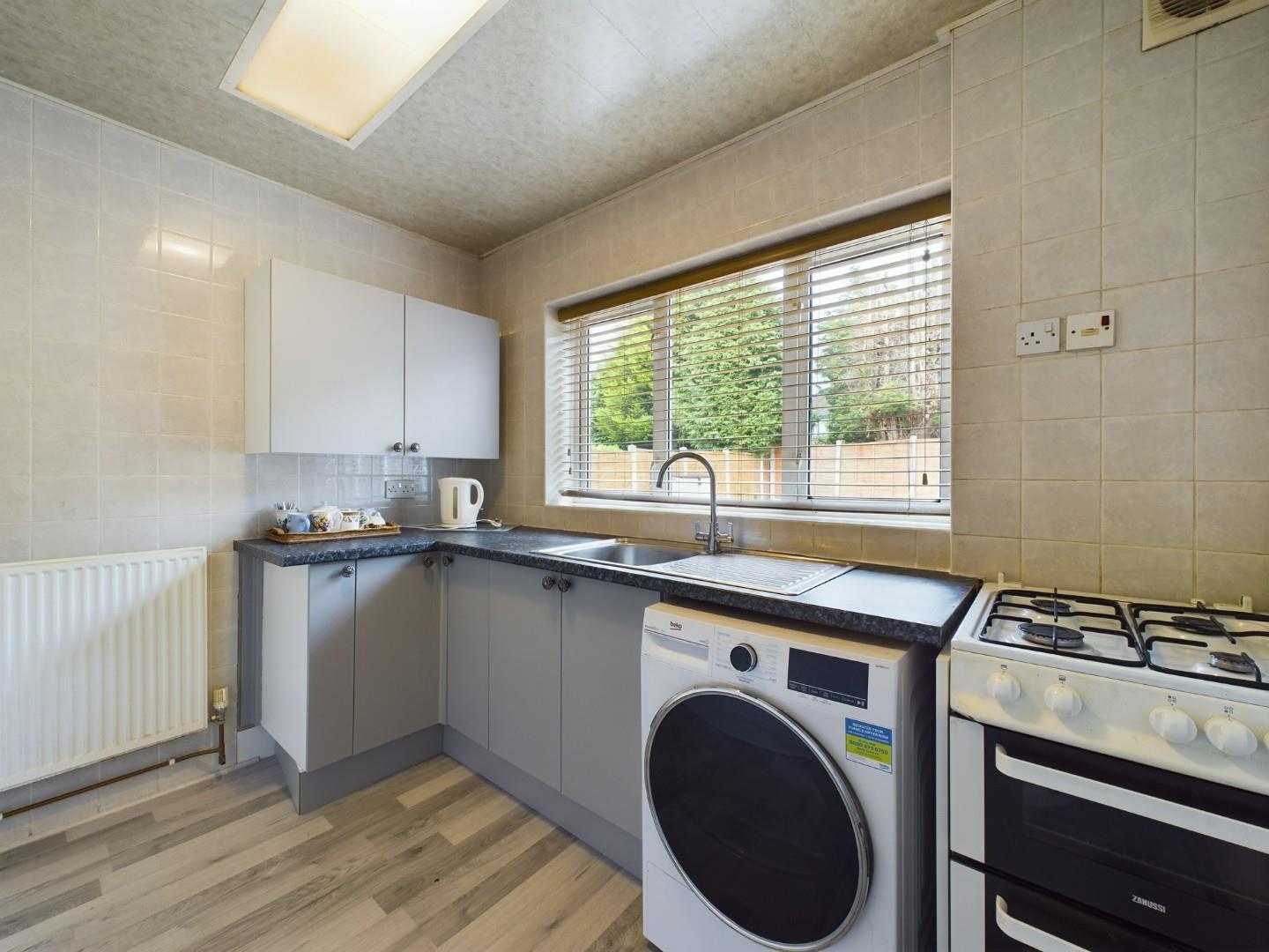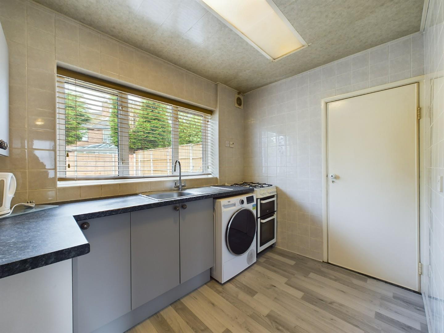 With a range of wall and base units, stainless steel sink with mixer tap, space for laundry machinery, gas outlet point to cooker, a door leading to the garage, a double glazed window to the rear and a central heating radiator