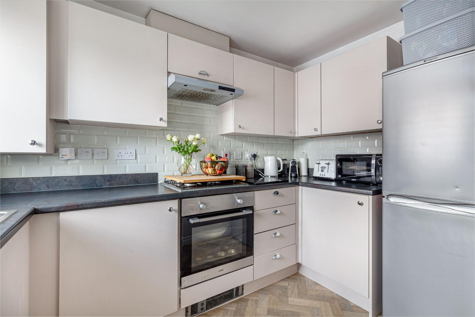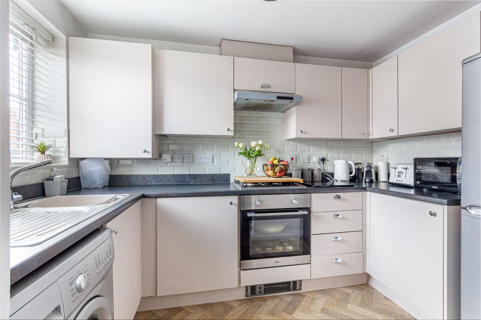 With an opening from the entrance hall, fitted with a range of wall and base units with worktops, upstands and tiled splash back, stainless steel sink and drainer, space for appliances, gas hob with electric oven, extractor fan, cupboard housing boiler and a double glazed window to front.
