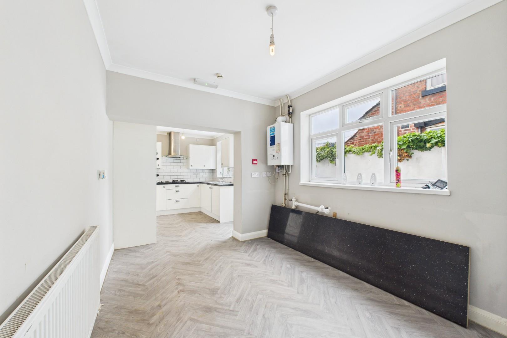 The ground floor also features a large open-plan dining room and modern kitchen, finished in stylish whites and greys, complete with an integrated oven, hob, and extractor fan.