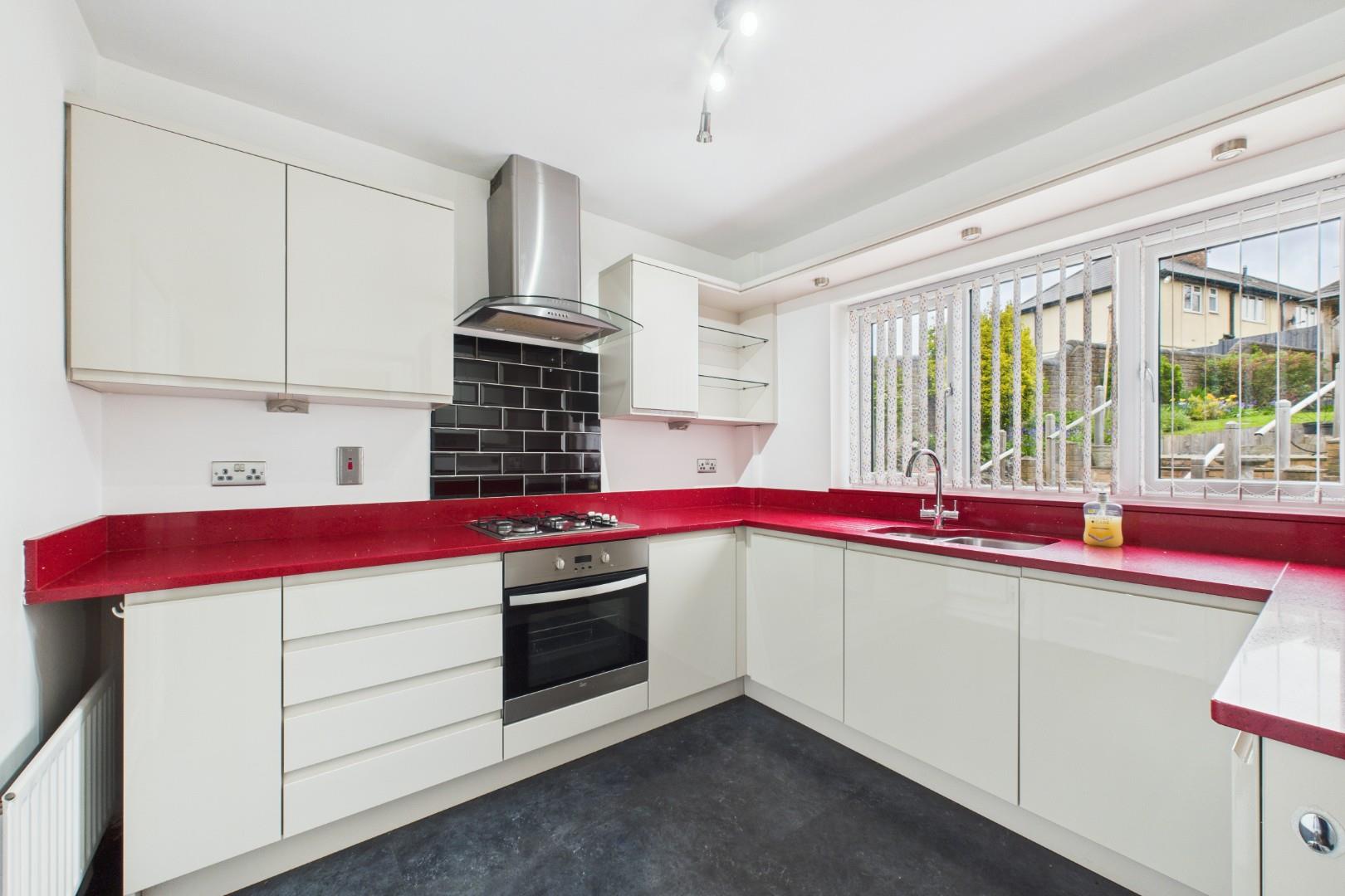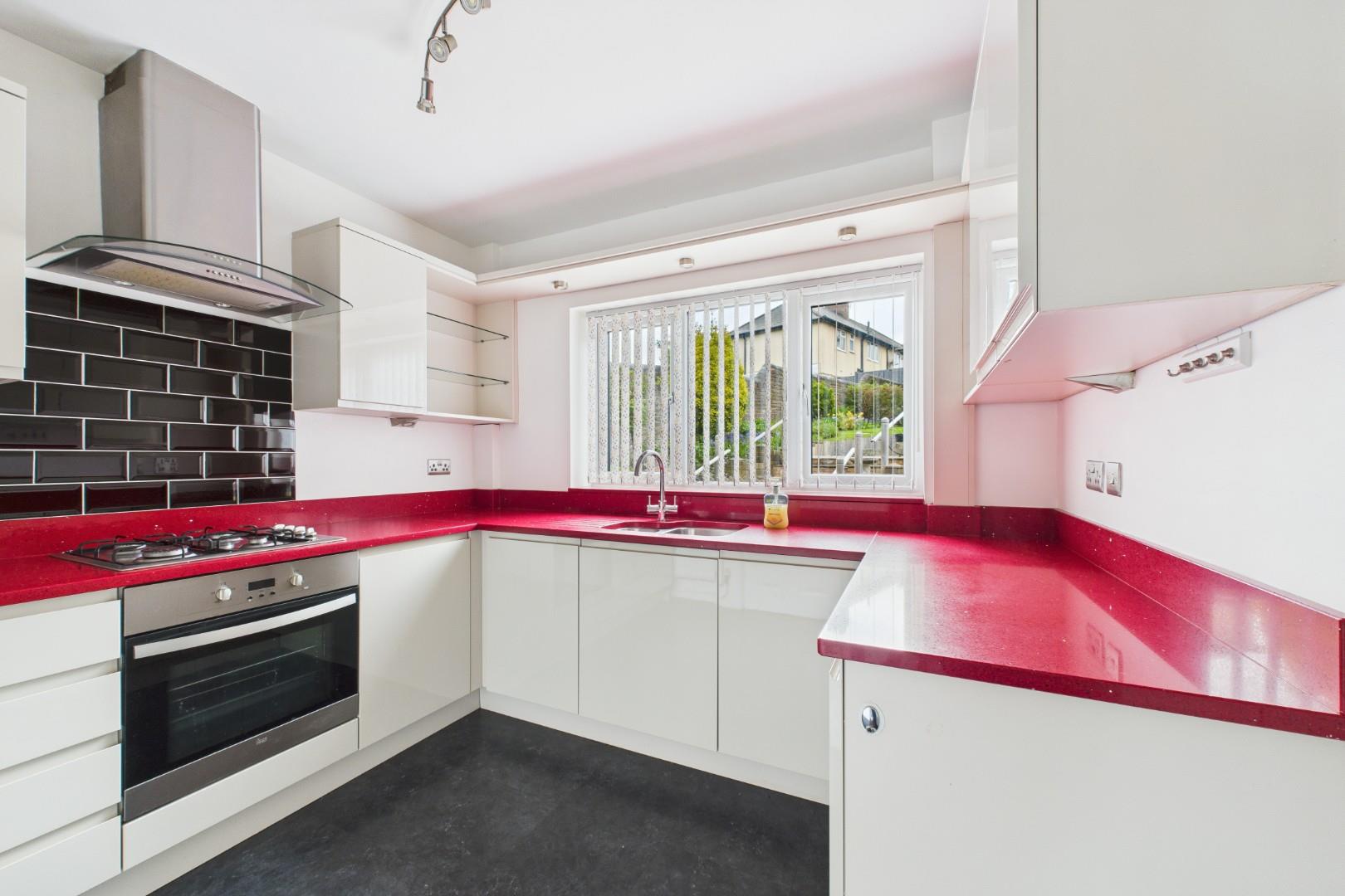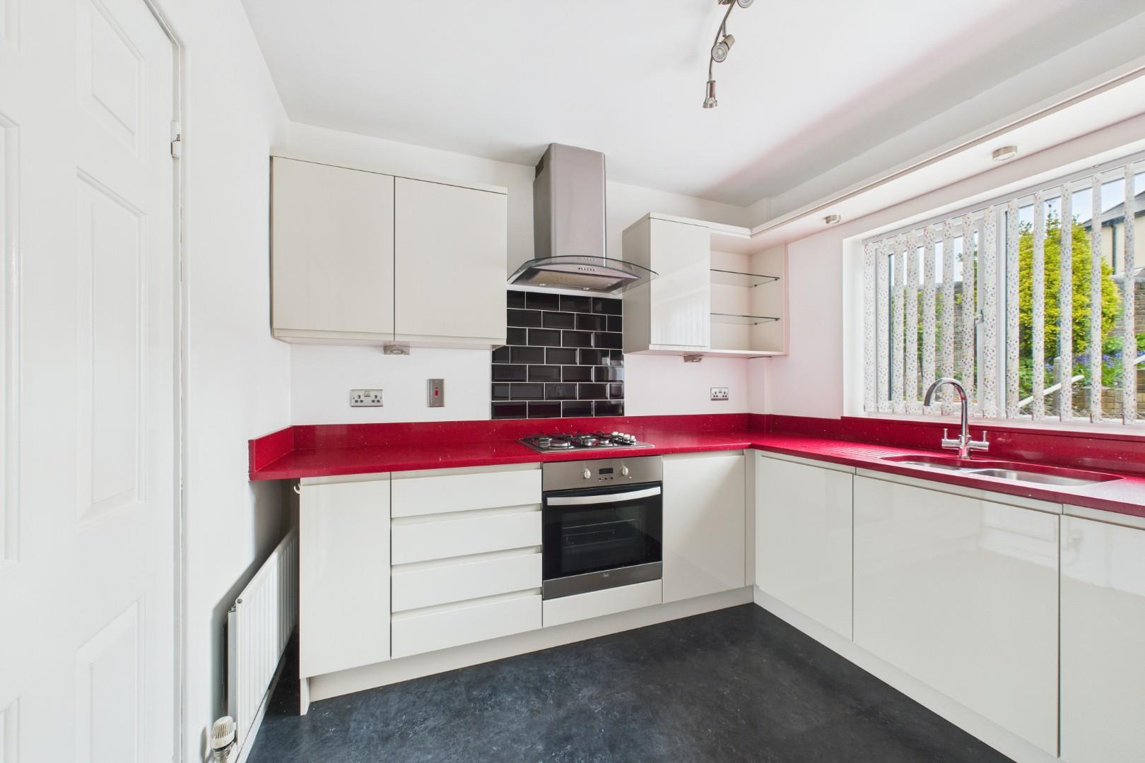 Double glazed window to the rear, double glazed door to the side. A range of wall and base units, integrated oven, hob and inset sink.