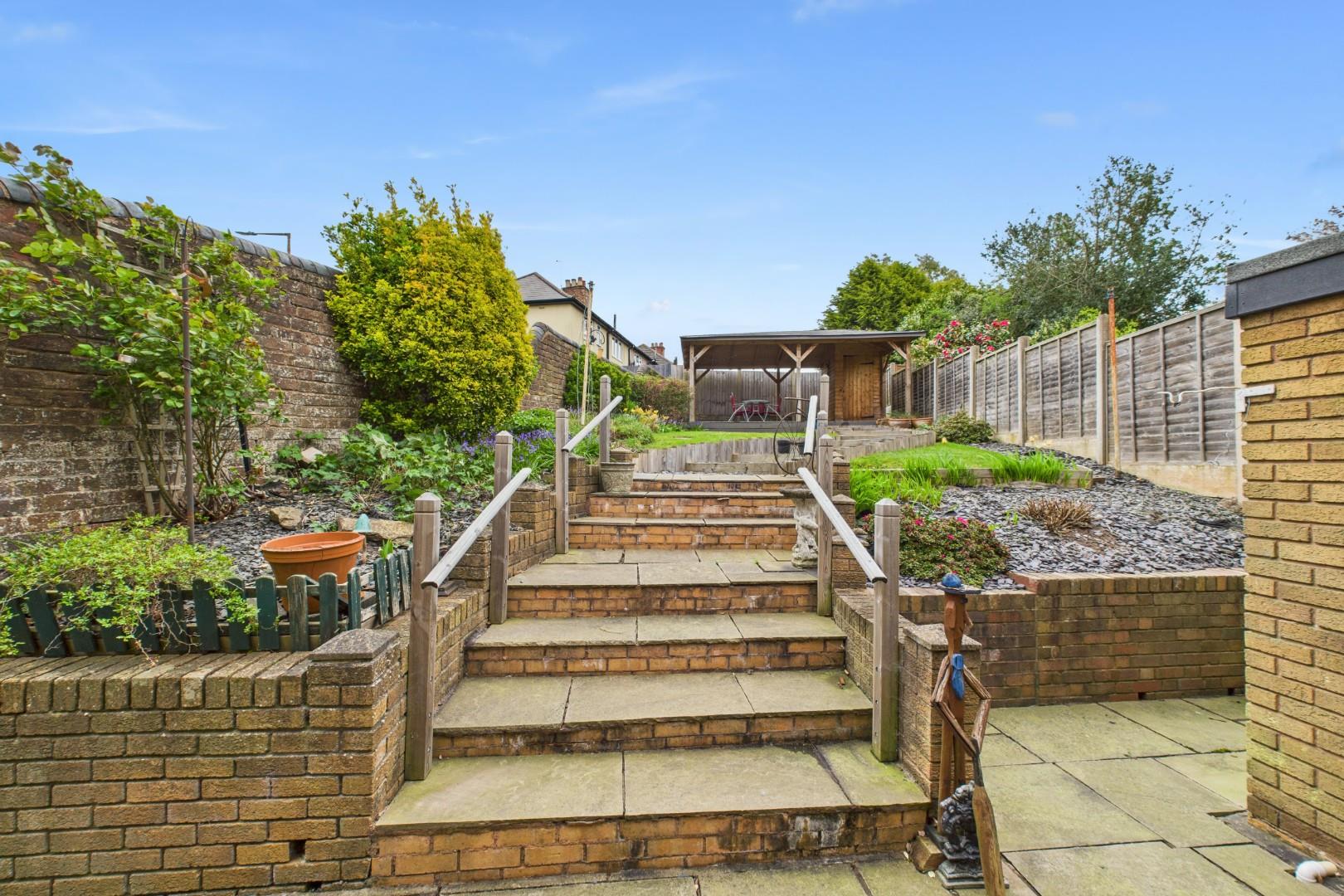 Paved patio to the rear of the house, leading up a few steps to the lawned area separated by a path leading to the covered decking area at the rear.