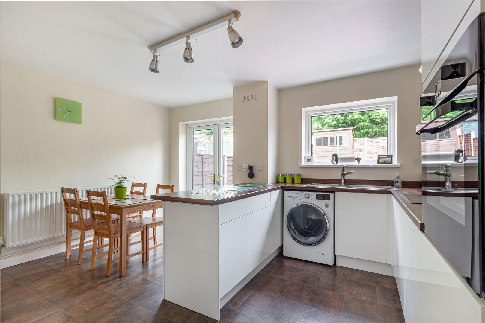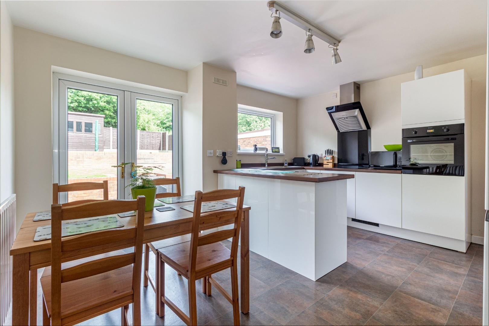 With a door leading from the entrance hall, fitted with a range of wall and base units with worktops above, breakfast peninsular with storage, integrated appliances including oven and hob with extractor above, sink with mixer tap, a door leading to the under-stairs storage cupboard, patio doors leading to the rear garden, a central heating radiator and a double glazed window to the rear