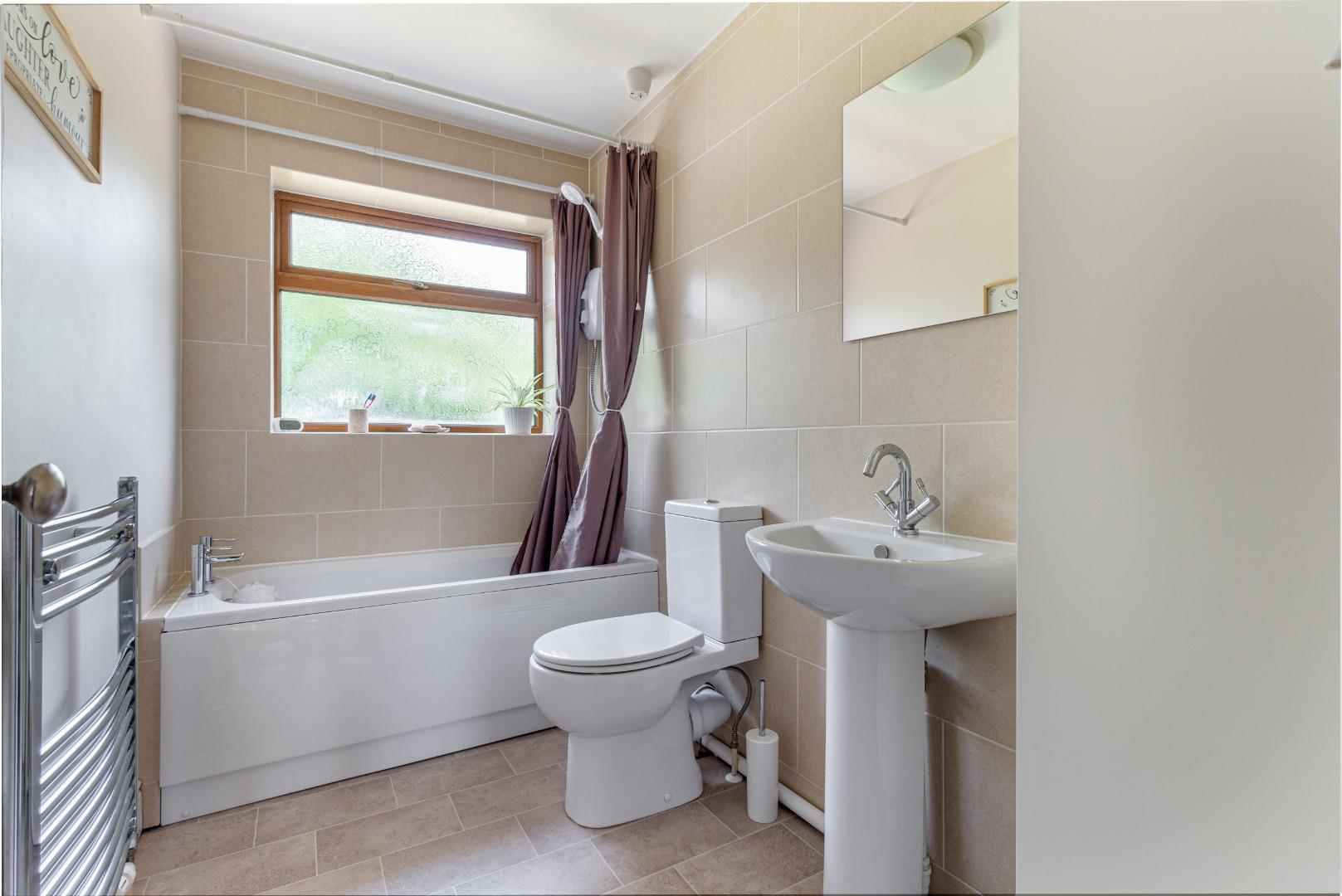 With a door leading from the landing, full height tile surround, WC, hand wash basin, bath with shower over, a double glazed window and a central heating radiator