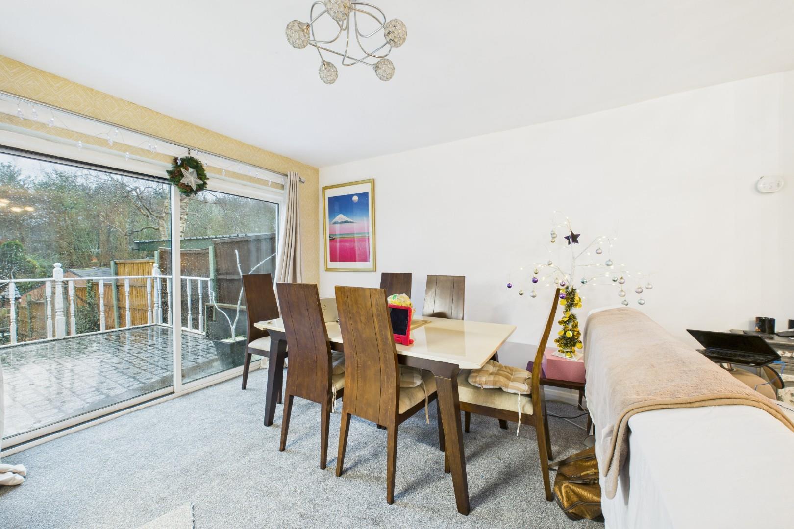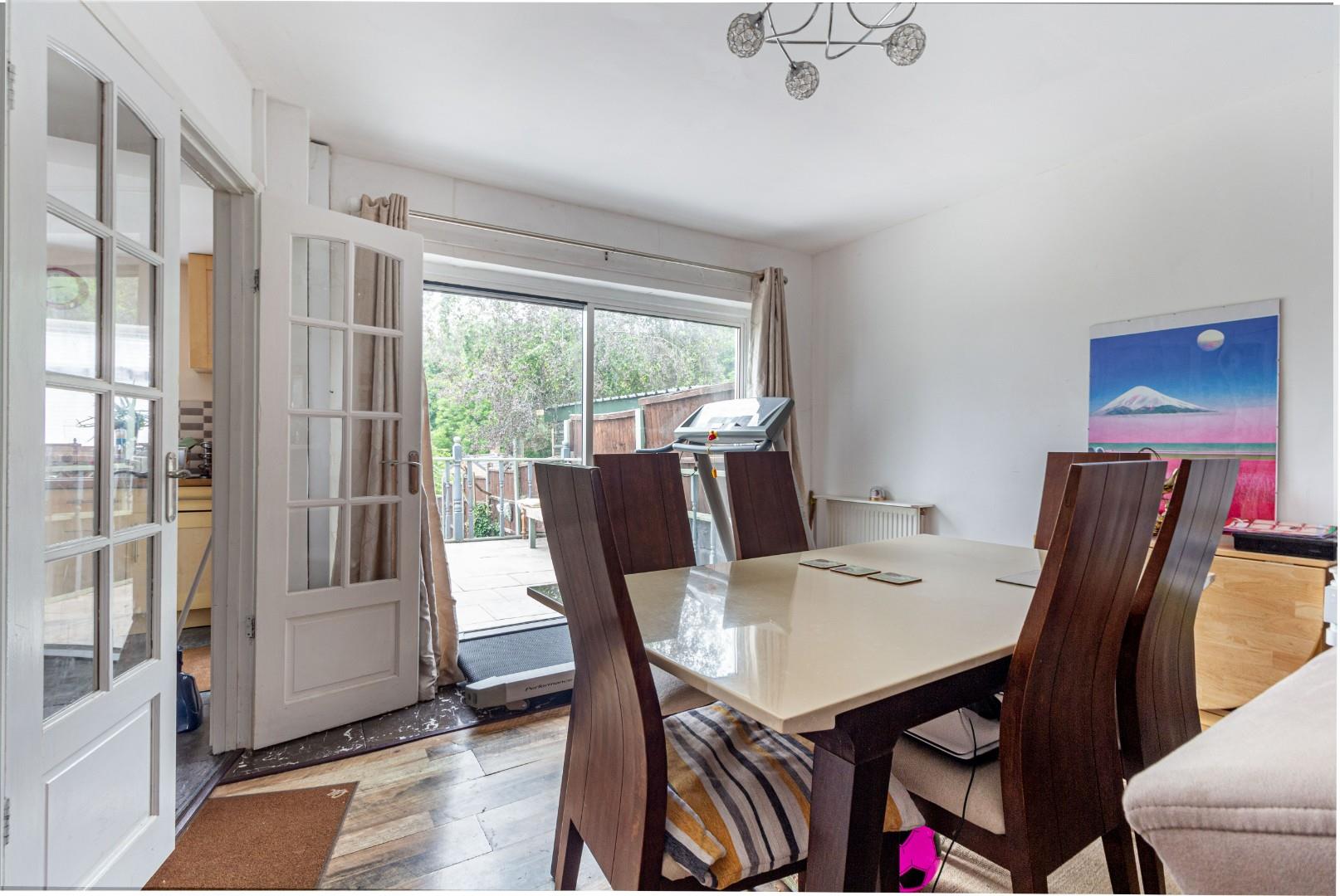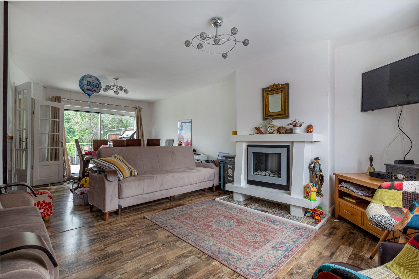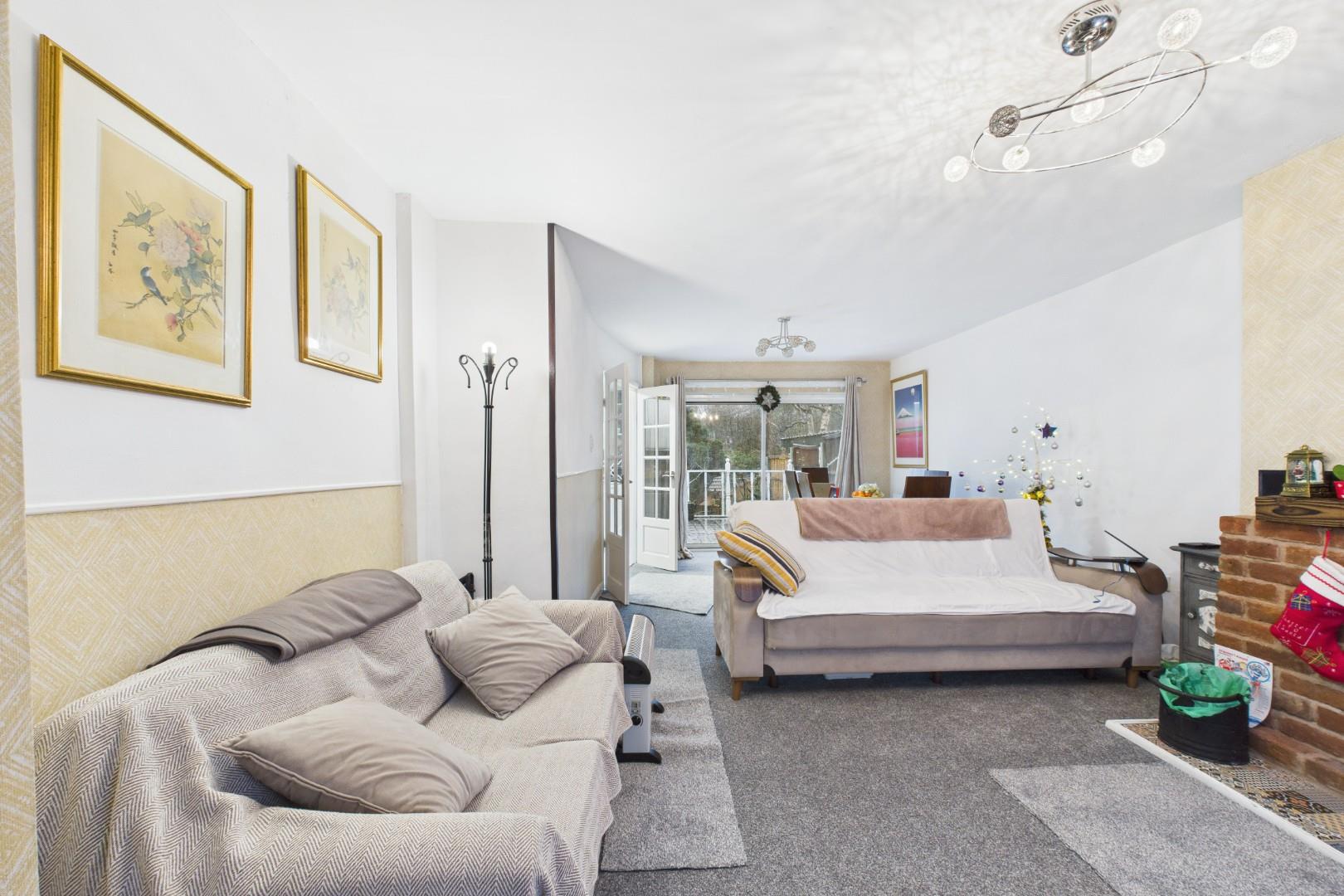 With a door leading from the entrance hall, a door leading to the kitchen, fireplace with decorative surround, a patio door leading to the rear garden, a double glazed window to the front and a central heating radiator