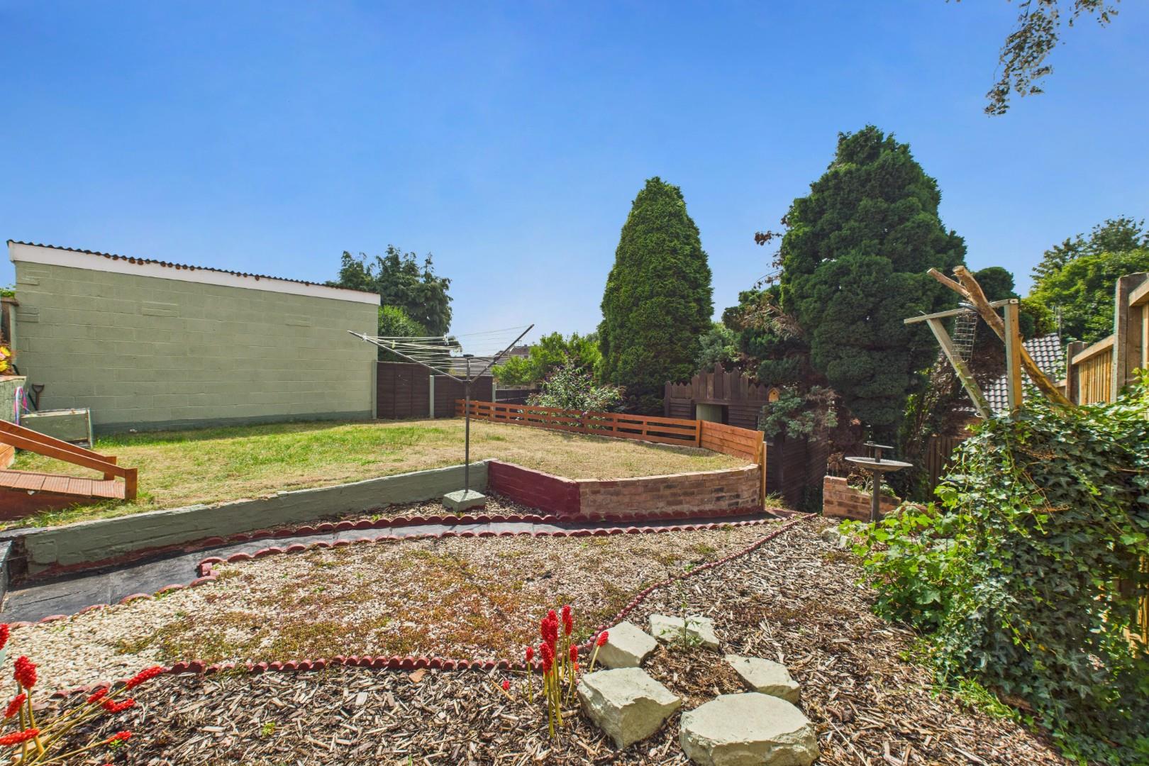 With a door leading from the lounge diner, raised patio area to the front with lawn beyond, shrub borders throughout and garden building to the rear