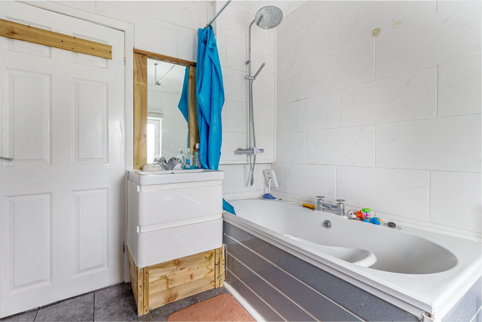 With a door leading from the landing, full height tile surround with WC, hand wash basin, bath with shower over, a double glazed window to the rear and a central heating radiator
