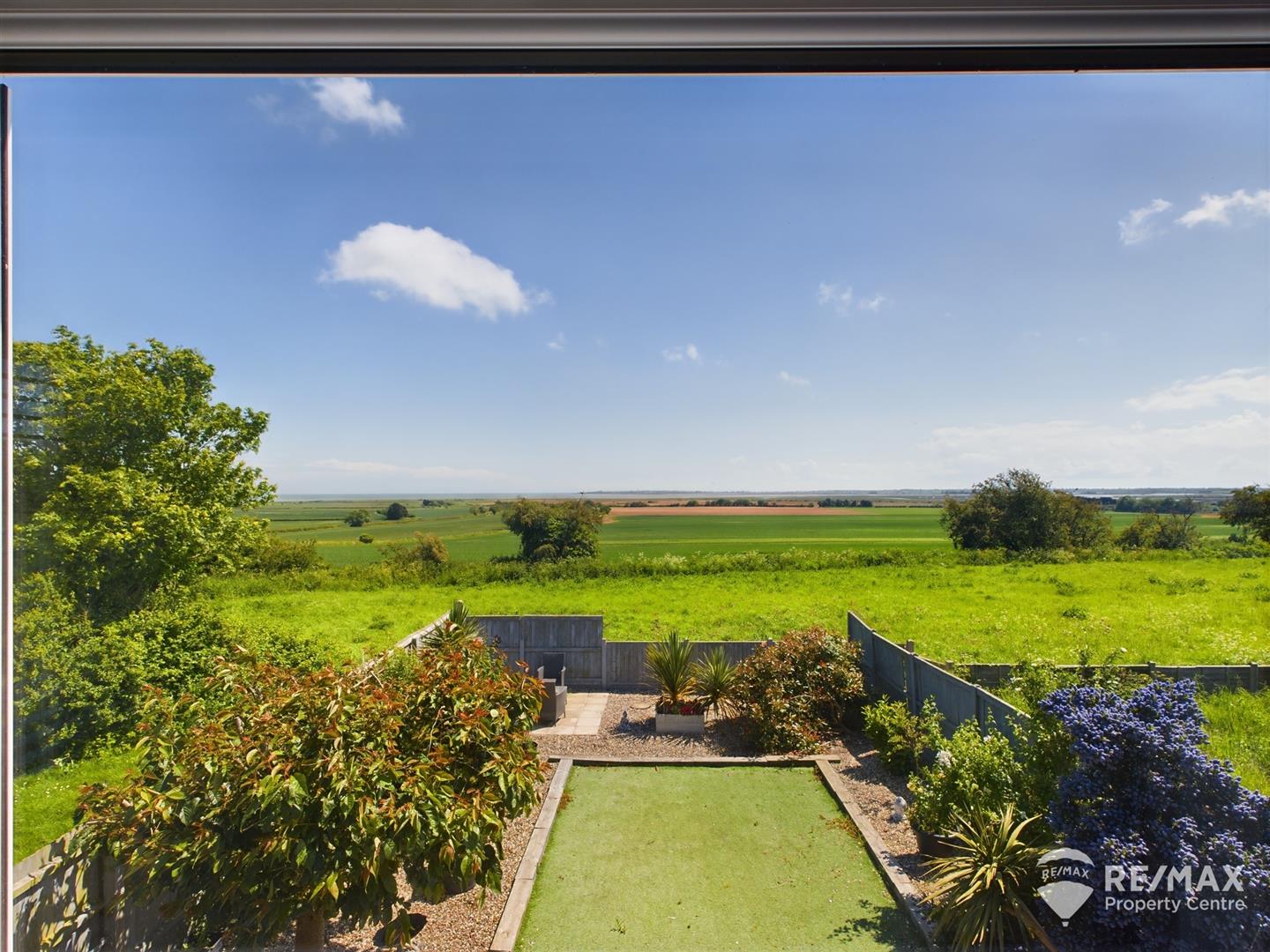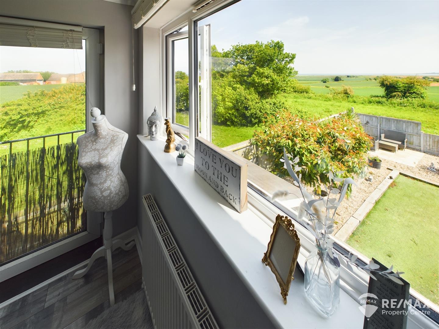 Full of light with window to front aspect, french doors to side aspect and a large window to the rear offering field and sea views