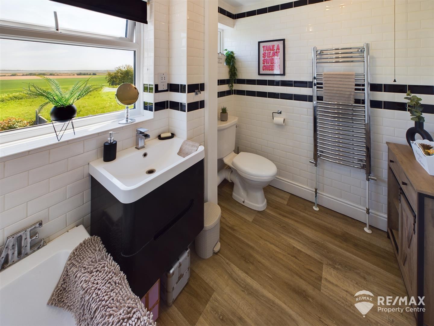 More field and estuary views from window to rear aspect, suite comprises panelled bath with wall mounted 'Aqualisa' shower, vanity wash hand basin with storage drawers, low level WC, chrome towel radiator and fully tiled walls