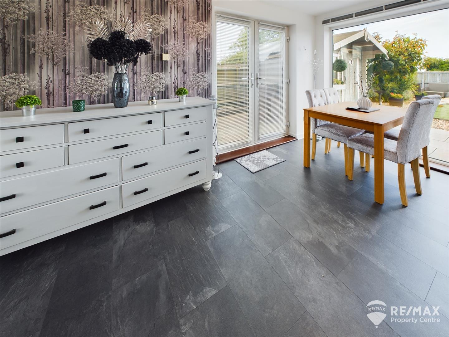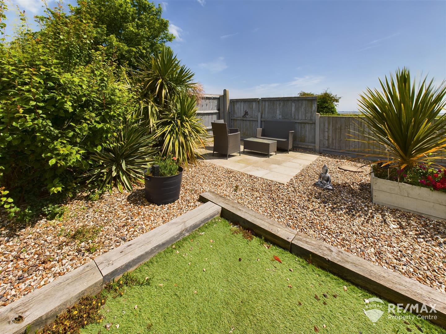 The low maintenance rear garden is fully enclosed and has a large patio area perfect for entertaining, artificial grass contained with wooden sleepers, shingled areas, mature shrubs and trees, wooden summerhouse/workshop with electric connected, and a seating area at the rear end with fabulous views across farmland to the Hamford Estuary