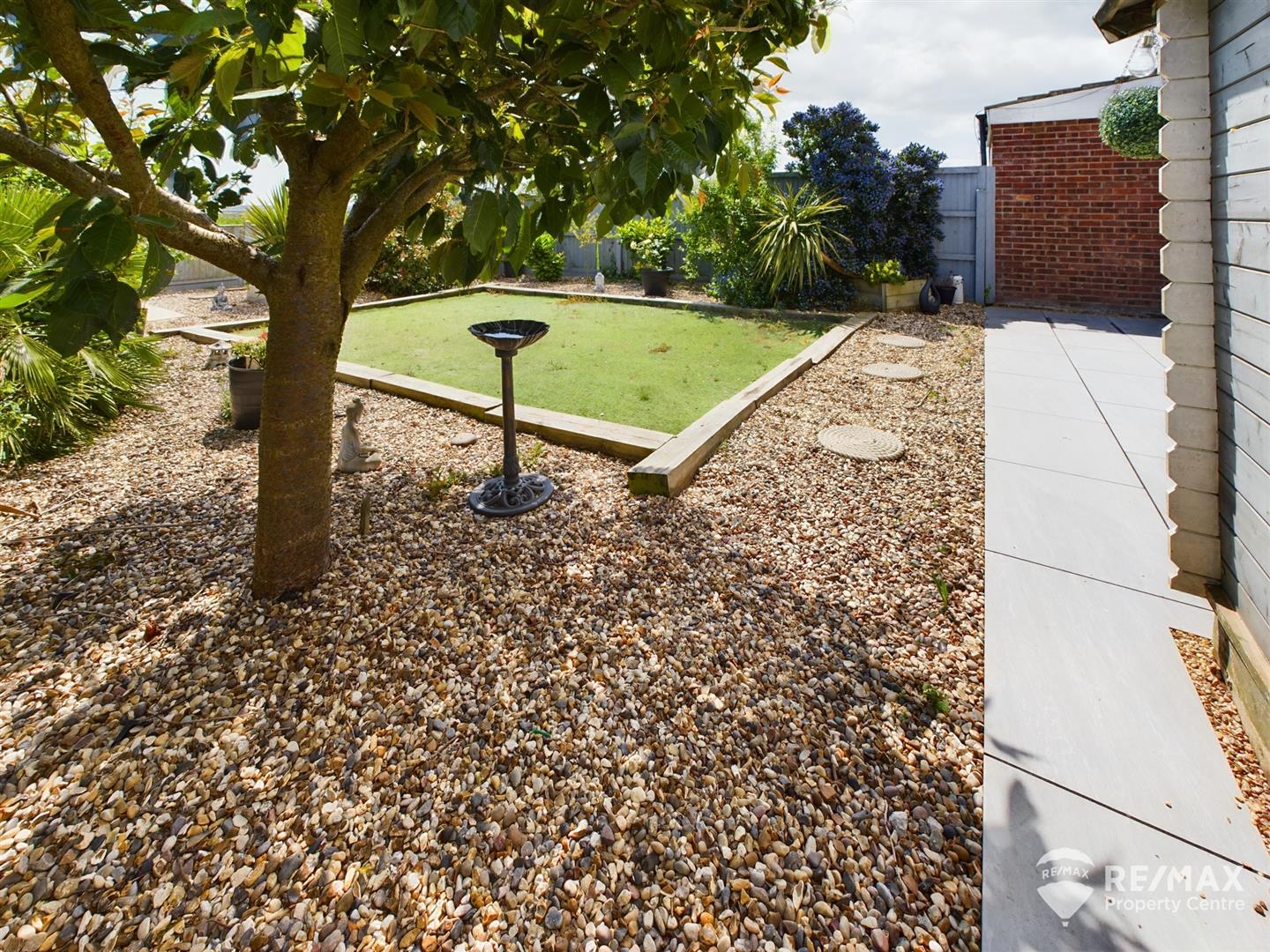 The front garden is contained by a picket fence with low maintenance with shingled beds, path to main entrance, gated side access with storage shed to the side of the property and access to the rear garden