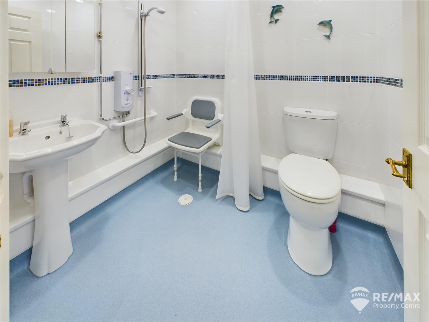Suite comprising a low level WC, pedestal wash hand basin and a spacious shower area with an electric Mira shower and handrails