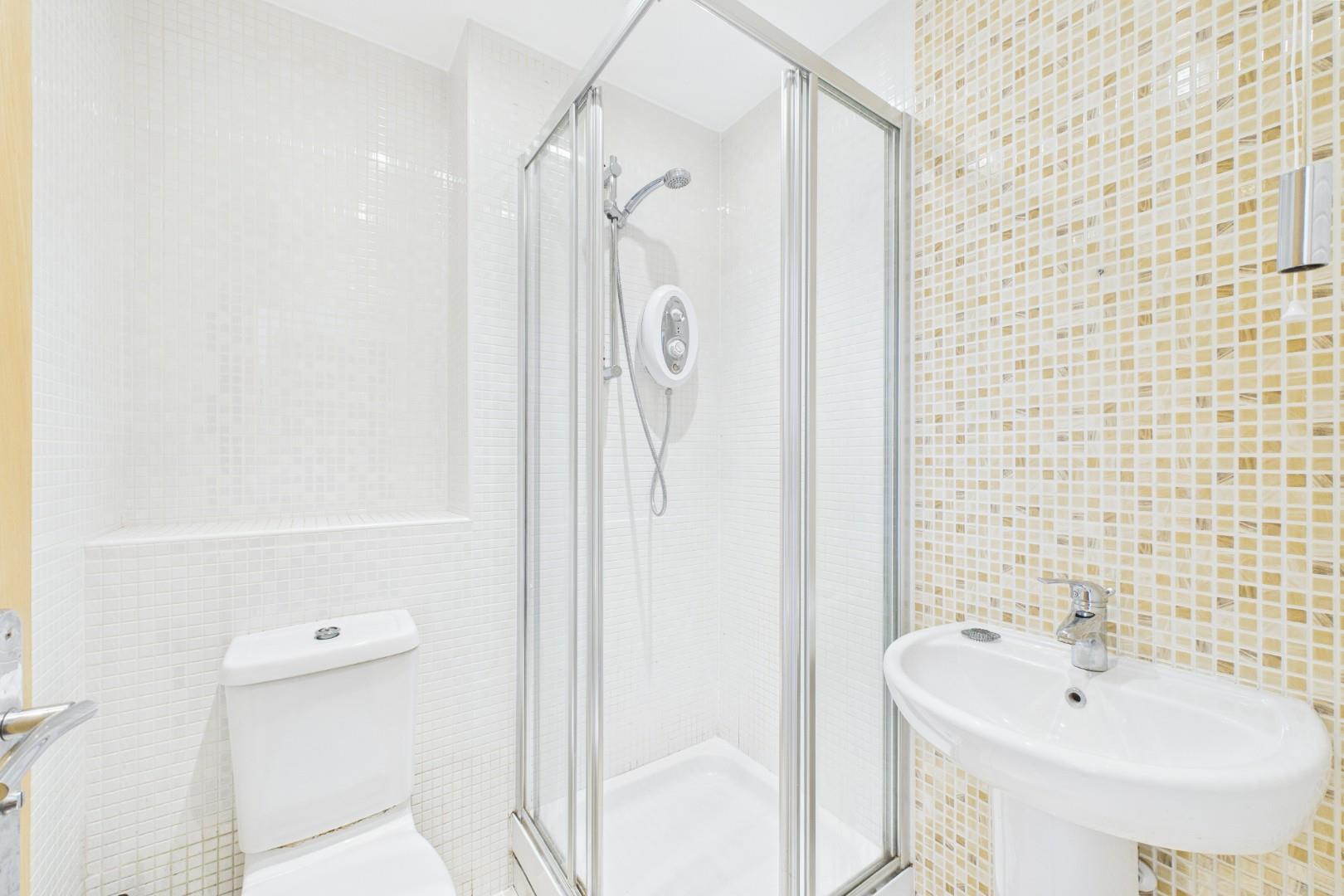 With a door leading from the bedroom, full height tile surround, WC, hand wash basin and a shower cubicle
