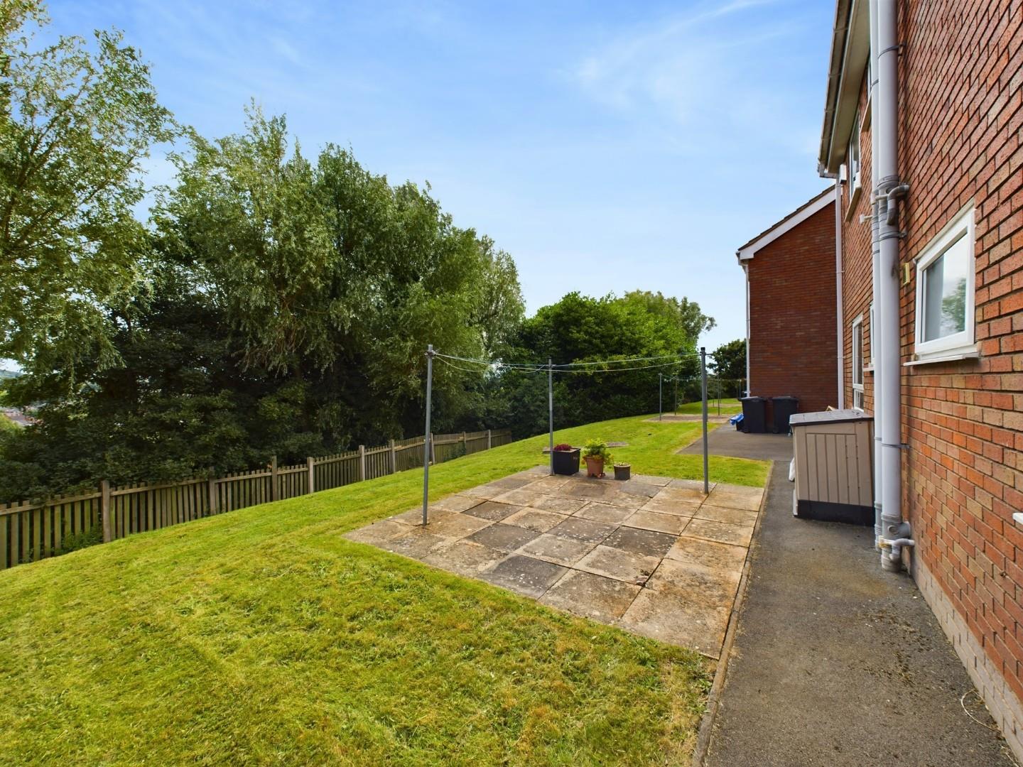 With a tarmacadam drive and lawn border leading to sheltered storm porch, storage cupboard and access to the communal garden