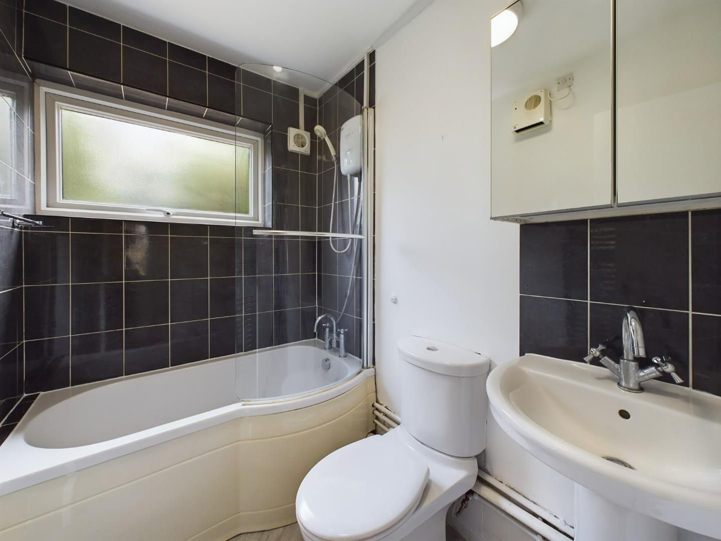 With a door leading from the hallway, sink with tiled splashback, bath with shower over and glass shower screen, WC and a double glazed window to the rear