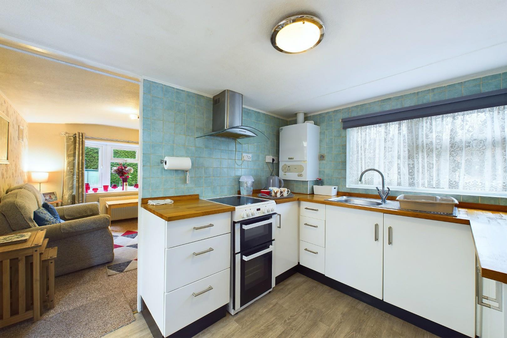 With doors to the living room, conservatory and hallway, fitted with a range of wall and base units with solid wooden worktops above, stainless steel sink with mixer tap and drainer, freestanding cooker with extractor hood above and a double glazed window to the front