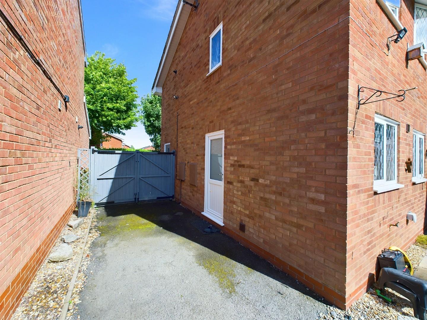 With a door leading from the kitchen, patio area to the front with lawn beyond, double opening side access gates to the front