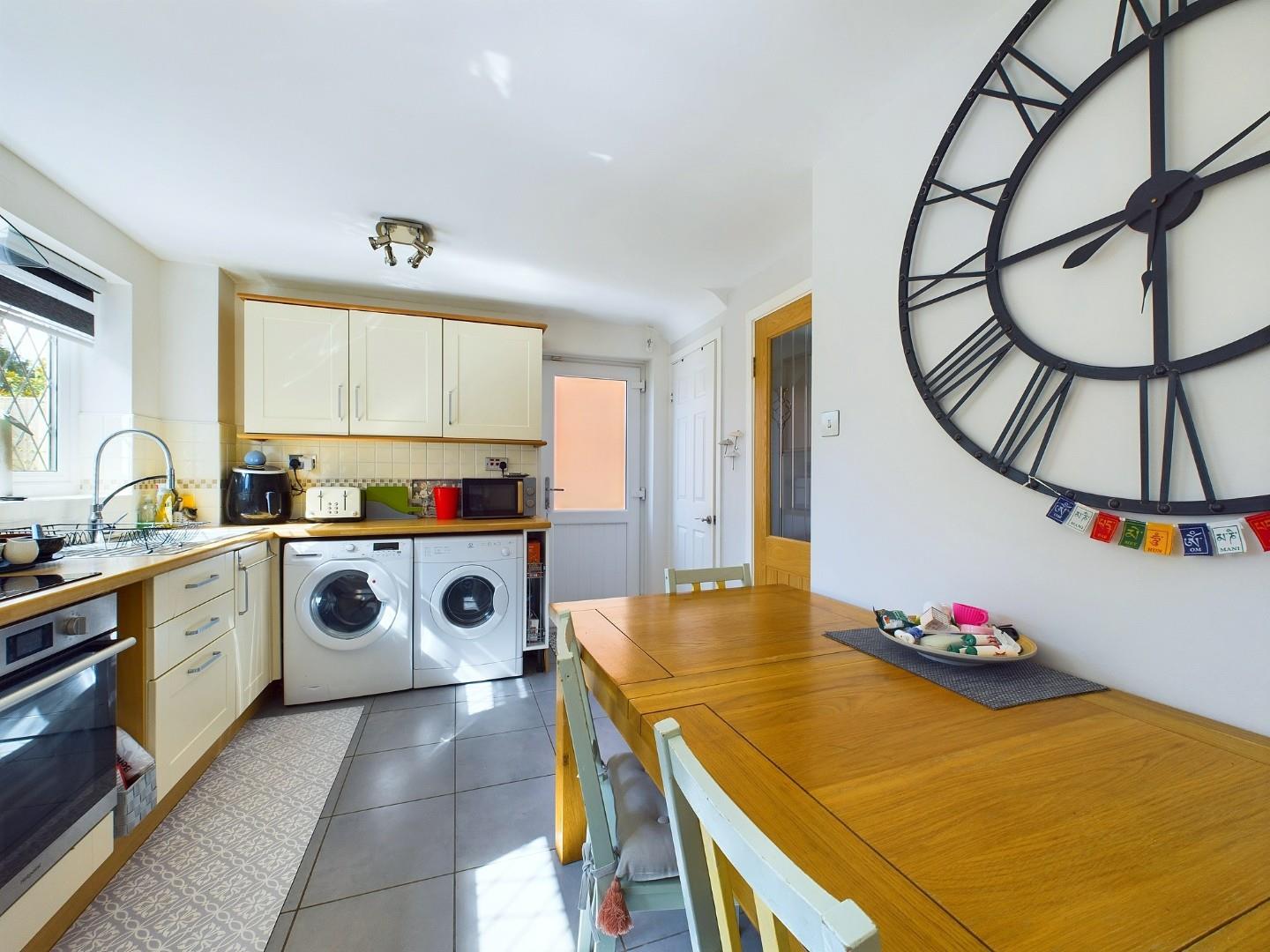 With a door leading from the living room, fitted with a range of wall and base units with worktops, integrated oven and hob with extractor hood above, sink with mixer tap, utility outlet points for laundry machinery, space for a dining table, a door leading to the under-stairs store cupboard, a door leading to the rear garden, double glazed windows to the rear and a central heating radiator