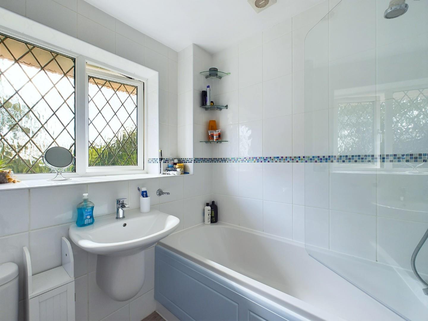 With a door leading from the landing, WC, hand wash basin, bath with shower over and full height tile surround, a central heating radiator and an obscured double glazed window to the rear
