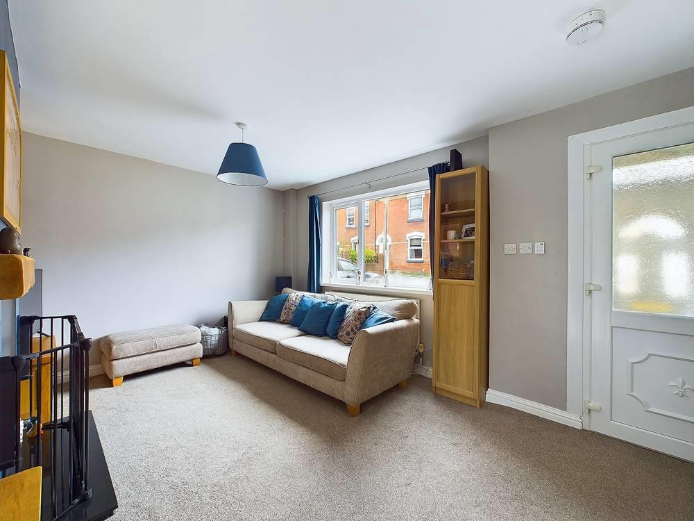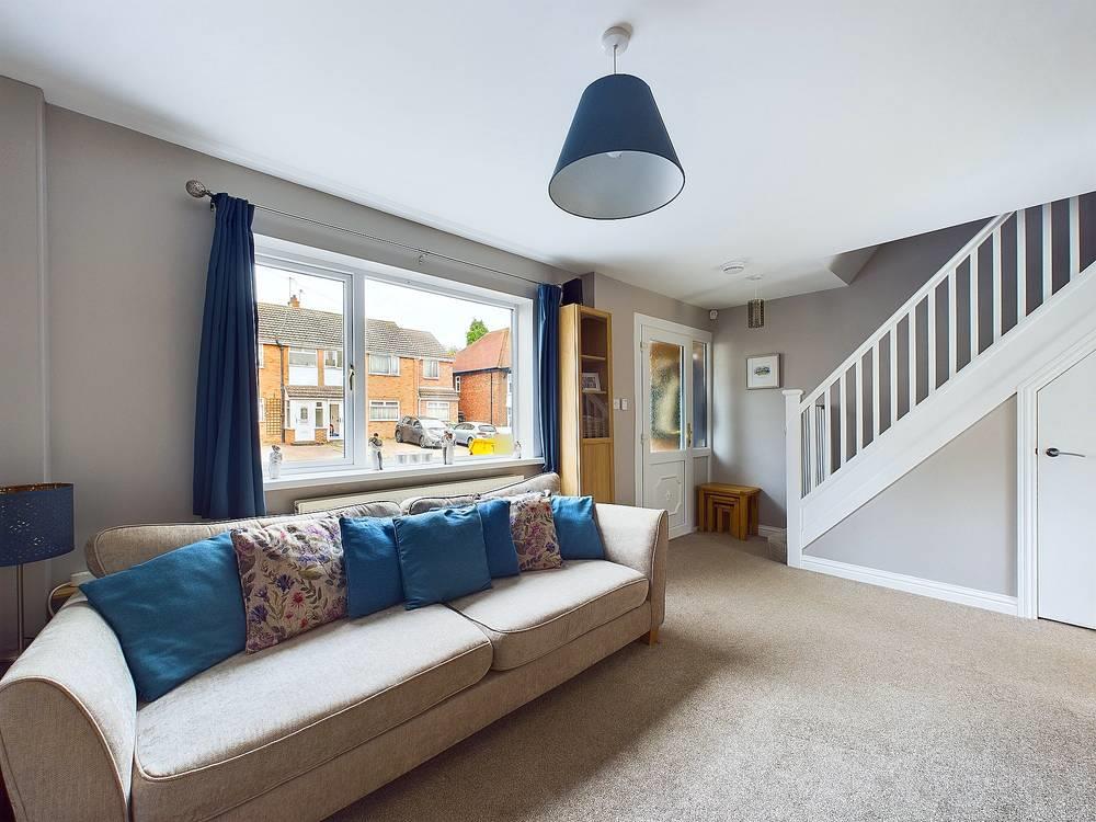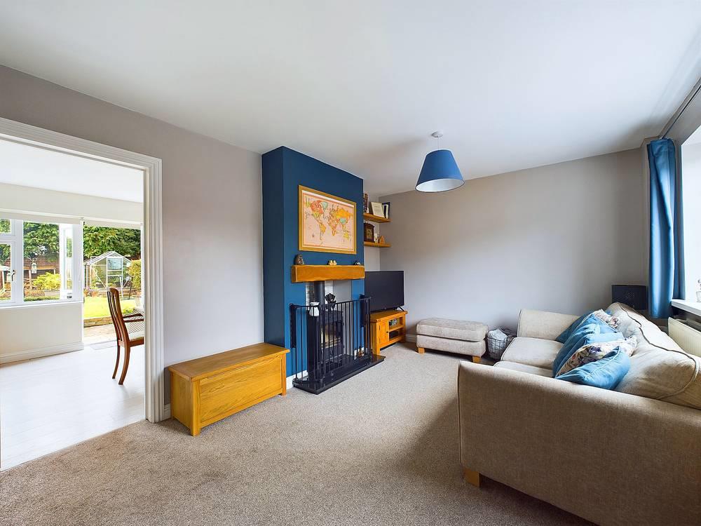 Leading from the entrance to the property, doors leading to the kitchen, log burning stove with hearth and 'Sleeper' style mantel, a double glazed window to the front and central heating radiator