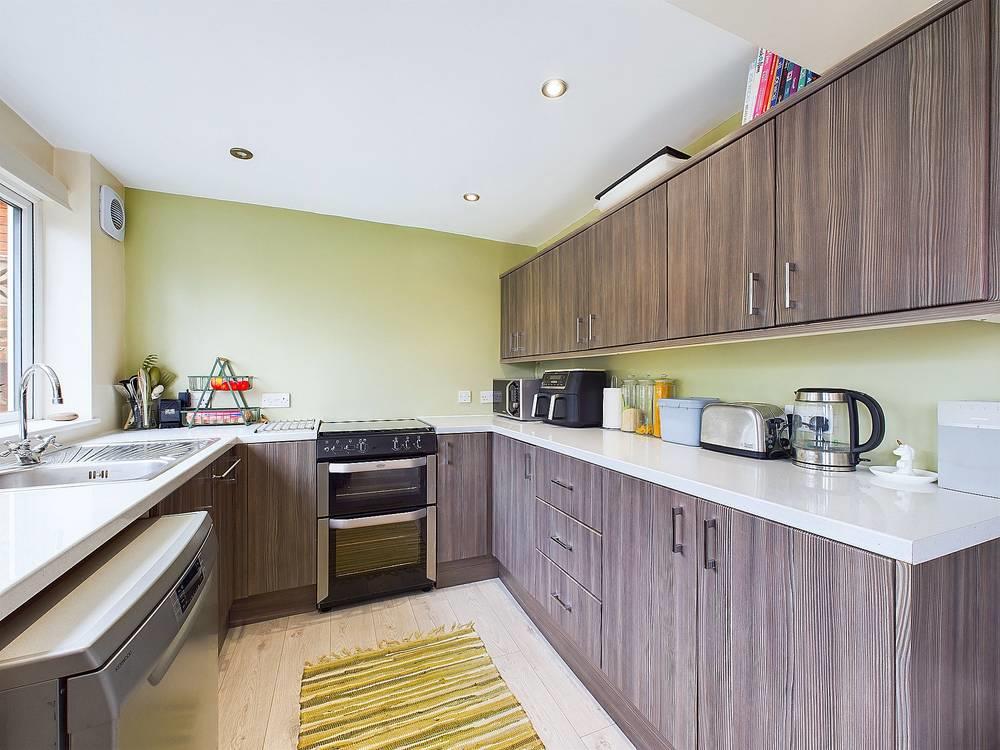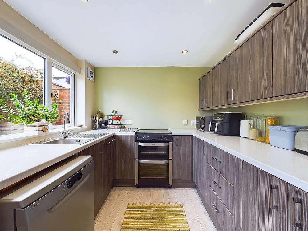 With a range of wall and base units with worktops above, stainless steel sink with mixer tap and drainer and a double glazed window to the rear