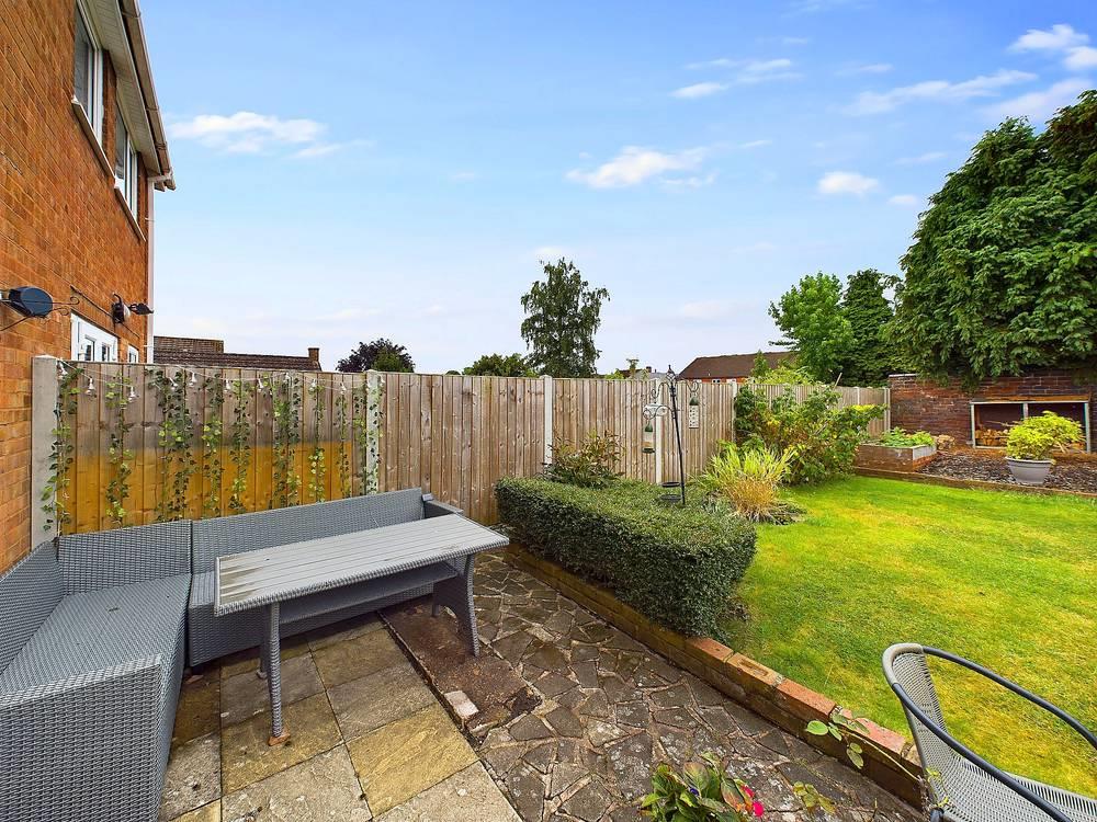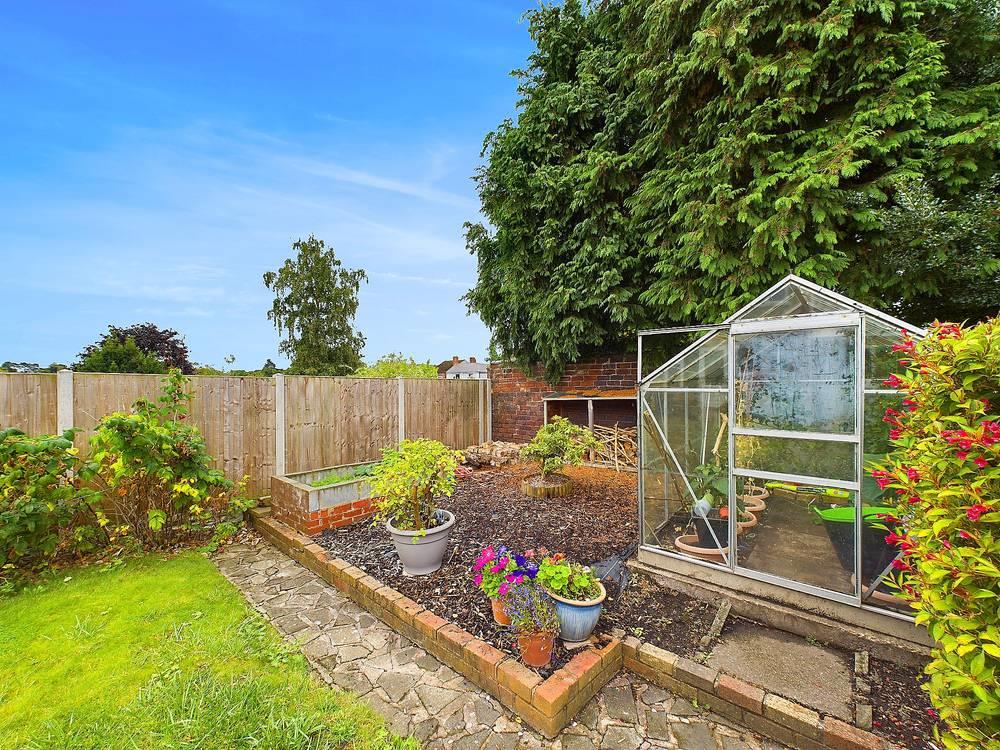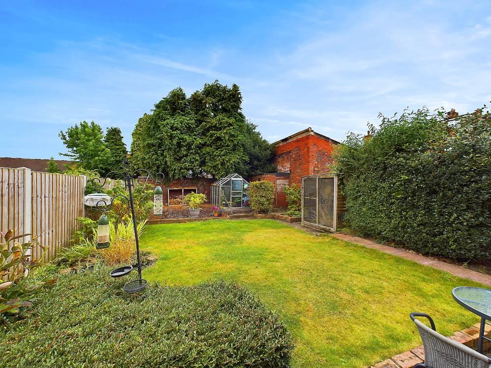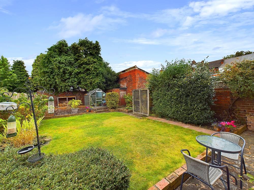 With a door leading from the dining room, patio area to the front with lawn beyond, shrub borders, garden building to the rear and a further door leading to the garage