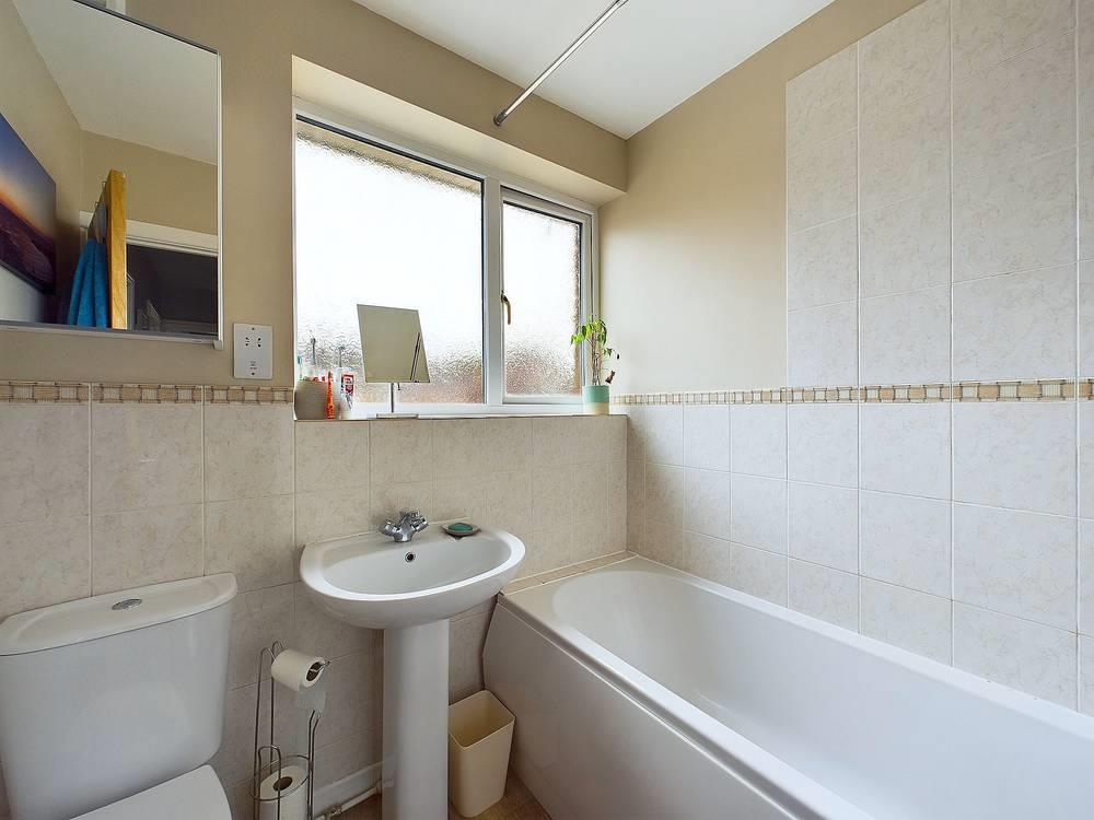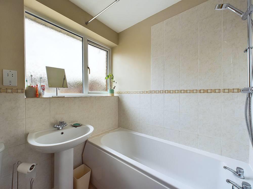 With a door leading from the landing, half height tile surround, WC, hand wash basin, bath with shower over and full height tile surround, a double glazed window to the front and a central heating radiator