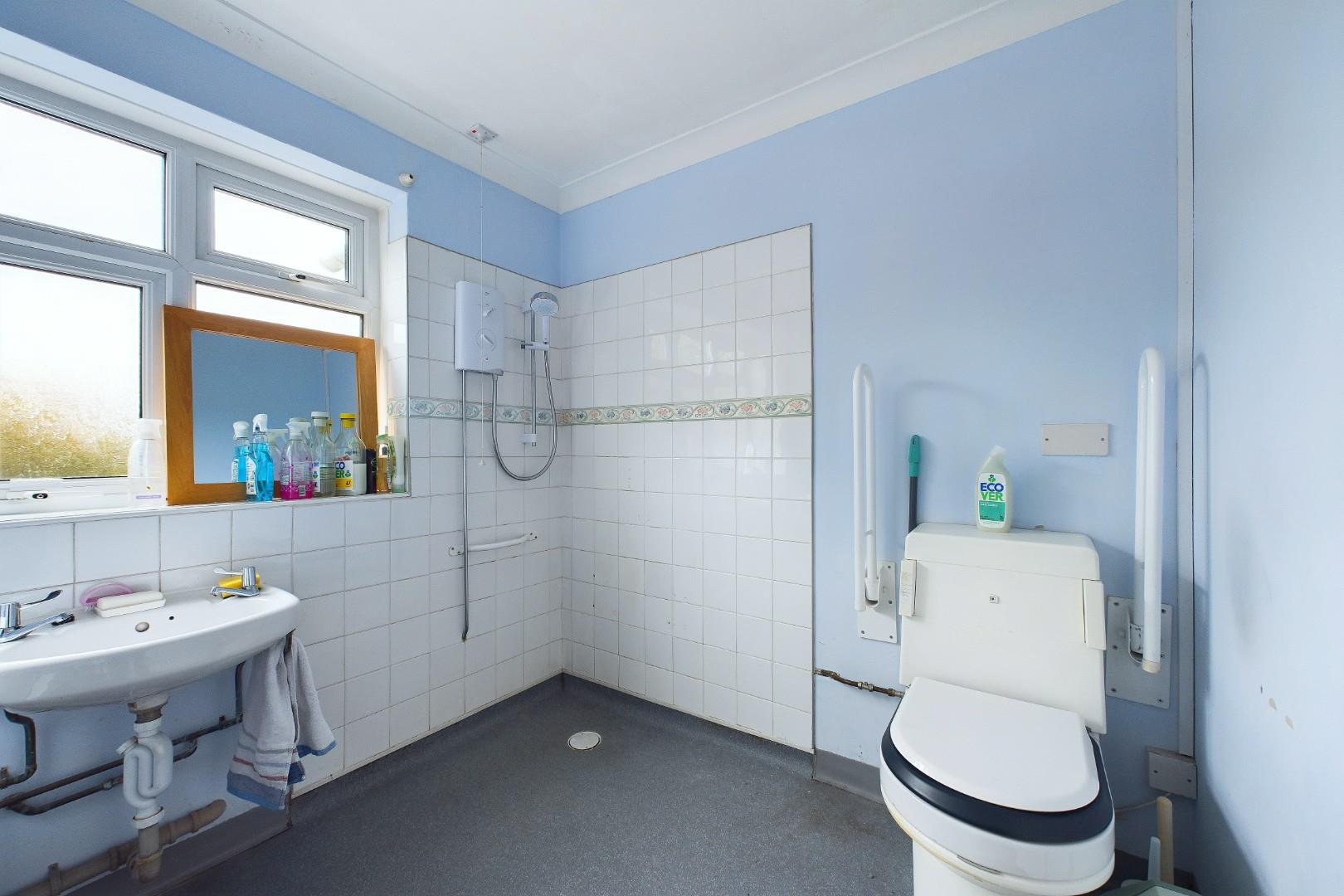 With a door leading from the kitchen, fitted with an accessible WC, hand wash basin, level access shower with full height tile surround, a door leading to the garage, a skylight window to the ceiling and a central heating radiator