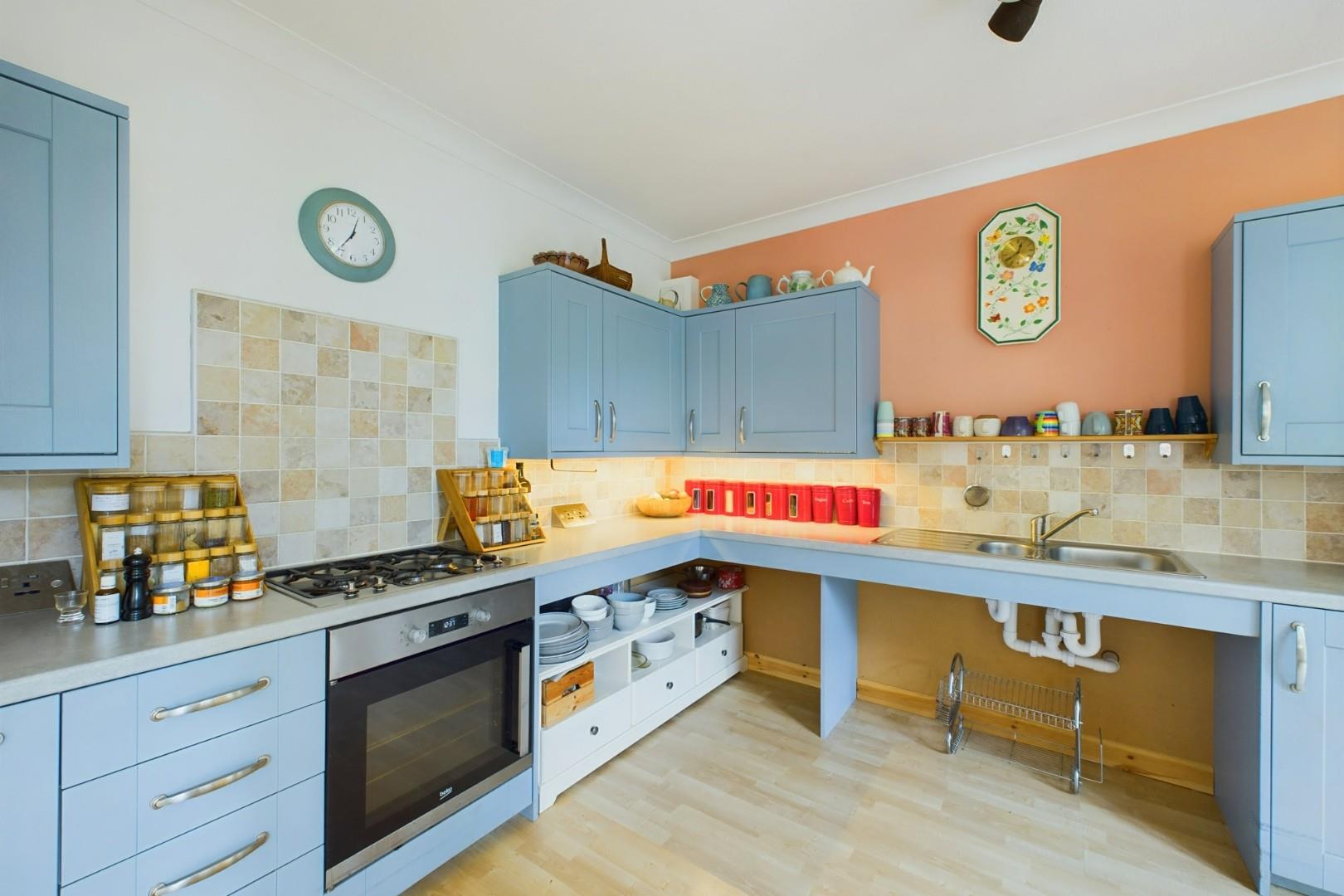 Being open plan to the living room, fitted with a range of wall and base units with worktops above, integrated oven and hob, stainless steel sink with mixer tap, doors leading to the bedroom and wet-room and double glazed windows to the side